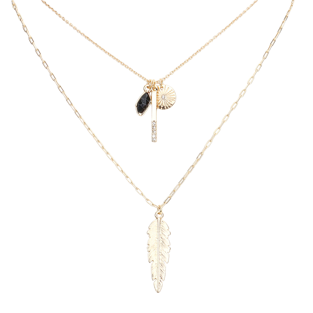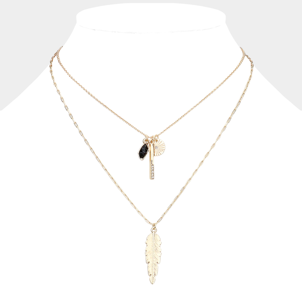 Natural Stone Rhinestone Metal Bar Feather Pendant Double Layered Necklace