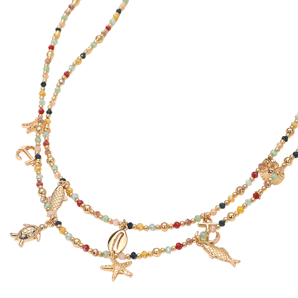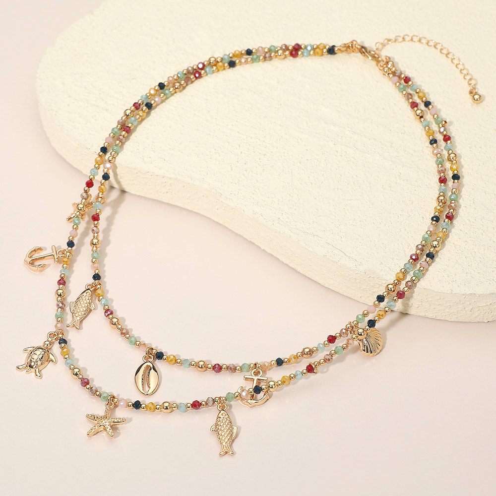 Details • Necklace Size : 16.5" + 3" L • Decor Size : 2" L • This layered beaded necklace features charming ocean-inspired pendants including seashells, fish, and anchors. A stylish accessory that brings a touch of coastal elegance to your look, perfect for adding playful detail to everyday or vacation outfits. • Lead and Nickel Compliant