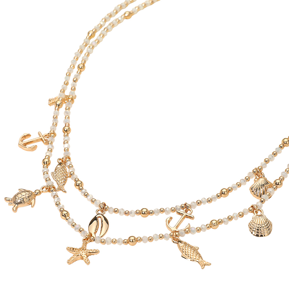 • This layered beaded necklace features charming ocean-inspired pendants including seashells, fish, and anchors. A stylish accessory that brings a touch of coastal elegance to your look, perfect for adding playful detail to everyday or vacation outfits.