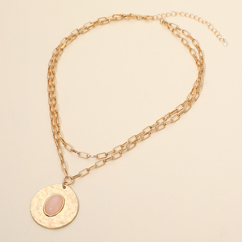 Details • Necklace Size : 15.5" + 3" L • Decor Size : 2" L • Pendant Size : 1.25" X 1.25" • A layered chain necklace featuring a round hammered-look pendant with a soft, polished centerpiece. Its double-chain silhouette adds dimension and elegance, creating a refined accessory that complements both everyday outfits and elevated looks with subtle, modern charm. • Lead and Nickel Compliant