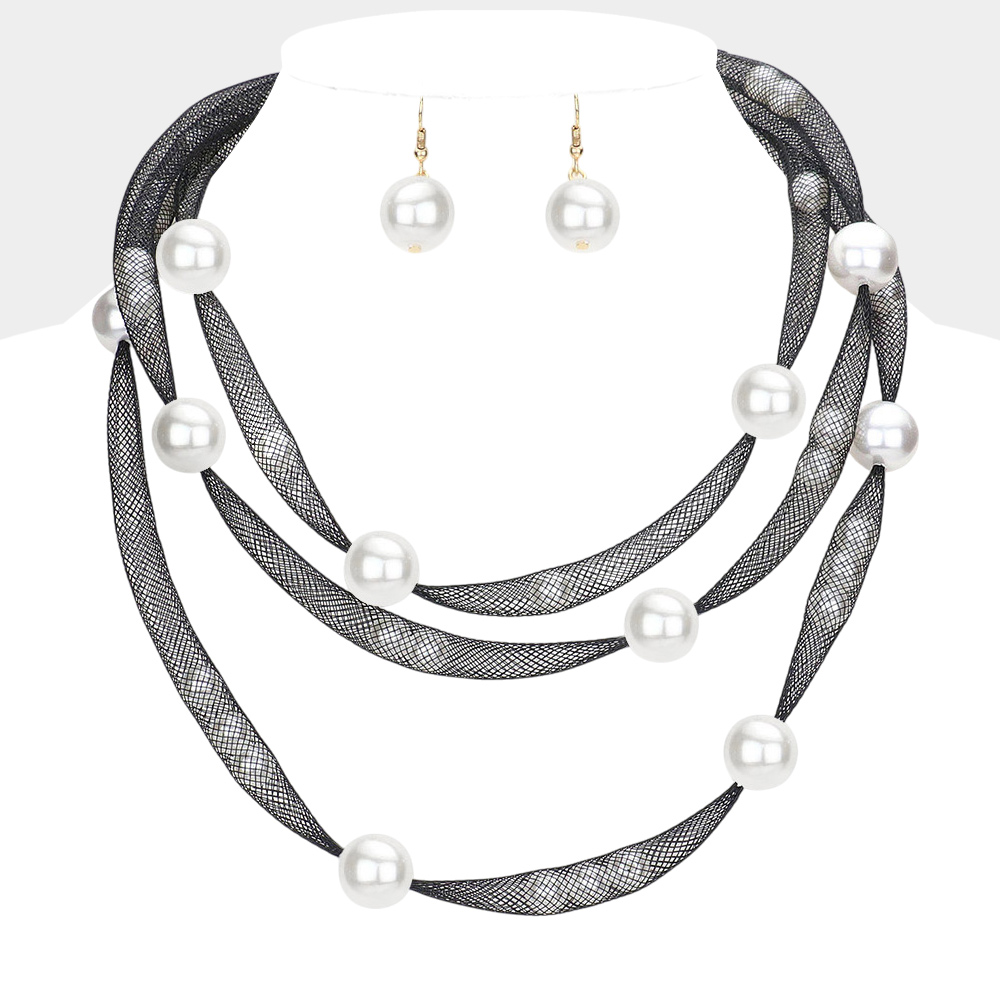 Pearl Accented Triple Layered Mesh Bib Necklace