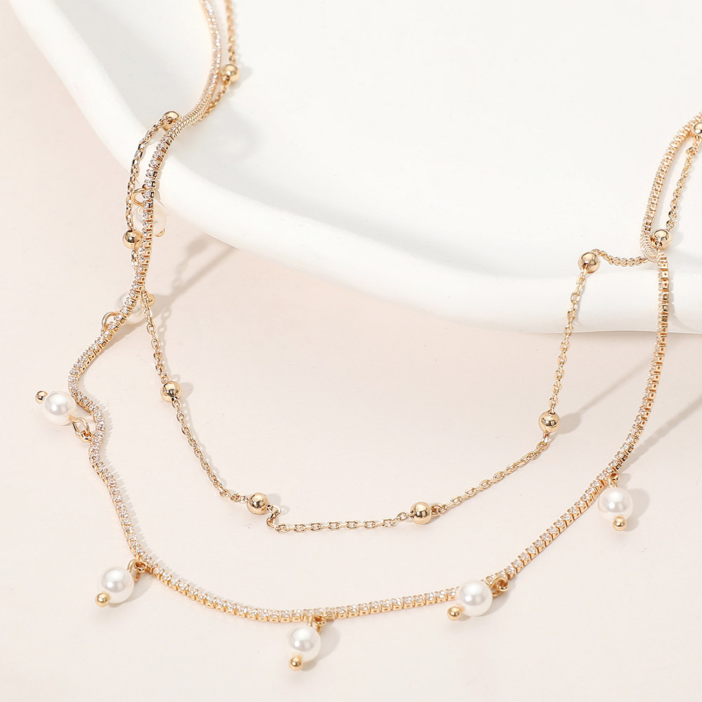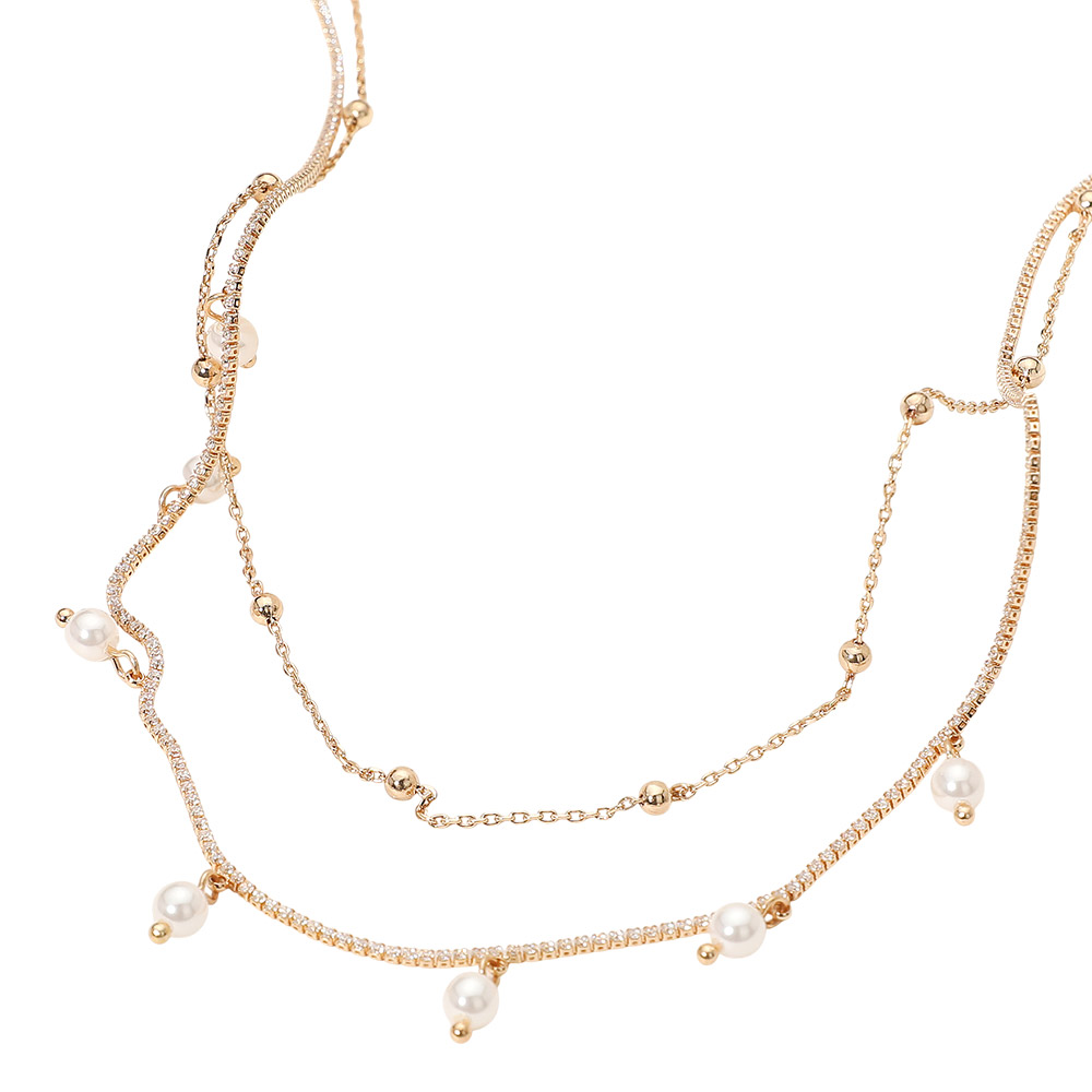 • This layered chain necklace features a refined mix of delicate beads and lustrous pearl-like accents for a graceful, feminine touch. Its versatile layered design complements any neckline, making it ideal for everyday wear or adding understated elegance to special occasions.