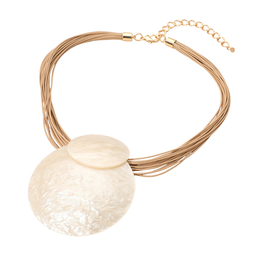 Details • Necklace Size : 18.5" + 3.5" L • Decor Size : 3.75" L • This layered disc pendant necklace showcases a modern, sculptural design with overlapping circular accents and multi-strand detailing. Its fluid shape and radiant finish create an elegant statement piece, ideal for adding a touch of artistic sophistication to any contemporary outfit. • Lead and Nickel Compliant