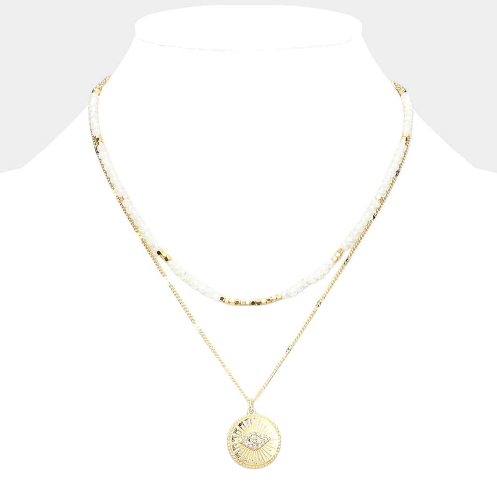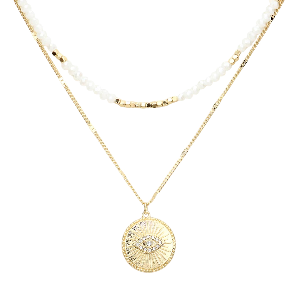Rhinestone Embellished Evil Eye Metal Round Pendant Double Layered Necklace