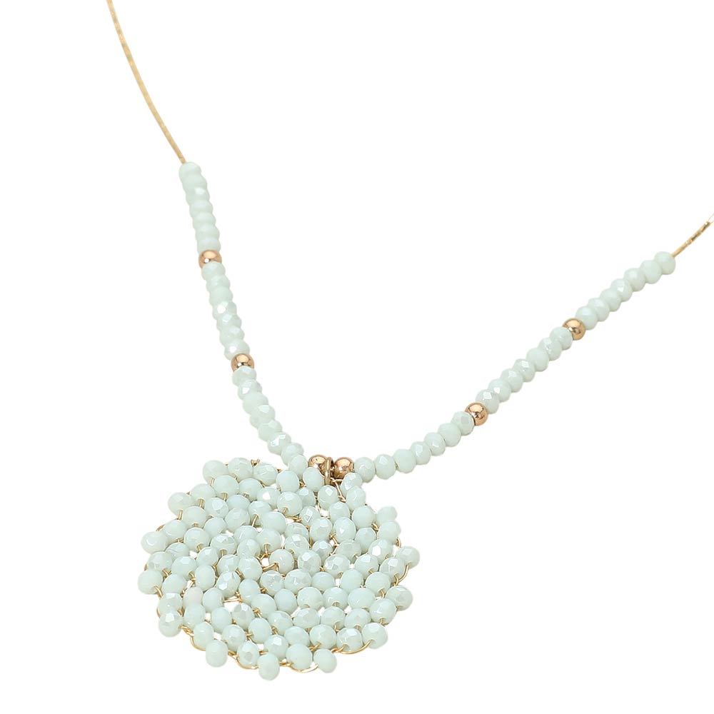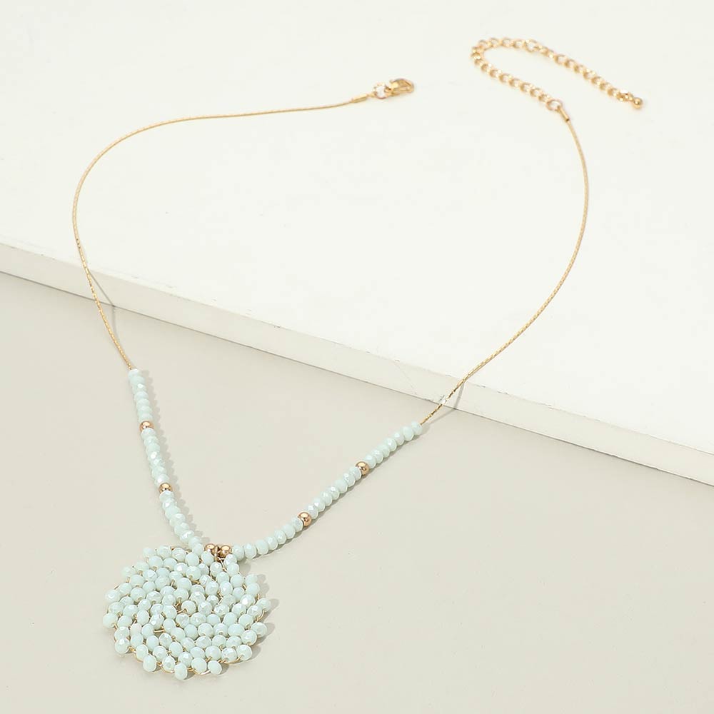 Details • Necklace Size : 16.5" + 3.25" L • Pendant Size : 1.4" X 1.4" • This beaded statement pendant necklace features a detailed round focal design paired with a delicately beaded strand for balanced visual appeal. Created to elevate everyday outfits, it layers beautifully or stands out on its own. A versatile accessory for boutiques seeking stylish, trend-forward pieces with a handcrafted look and timeless wearability. • Lead and Nickel Compliant