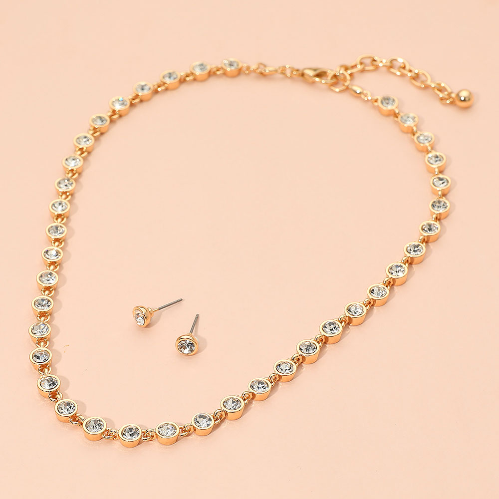 Details • Necklace Size : 16" + 2" L • Decor Size : 0.25" L • Earrings Size : 0.25" L • Add a touch of sparkle to your style with this rhinestone necklace and stud earring set. Featuring dazzling stones in a refined design, this elegant duo offers timeless sophistication for both everyday wear and special occasions, enhancing any outfit with radiant charm. • Lead and Nickel Compliant
