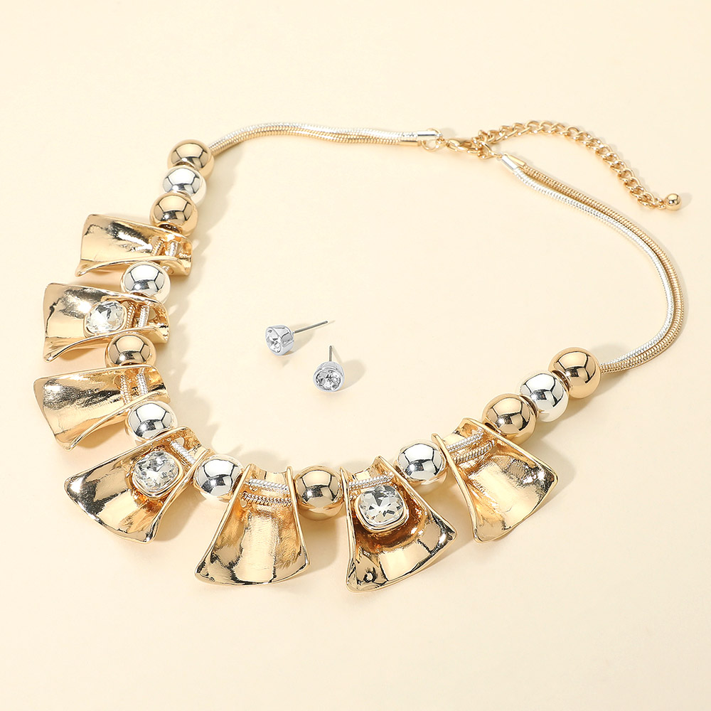 Details • Necklace Size : 18" + 3.25" L • Decor Size : 1.25" L • Earrings Size : 0.3" L • Statement necklace and stud earring set designed with bold sculpted accents, rounded bead detailing, and radiant stone highlights for a dramatic, fashion-forward look. Perfect for elevating dresses, evening wear, or special occasion outfits. A standout accessory ideal for gifting or curated boutique jewelry collections. • Lead and Nickel Compliant