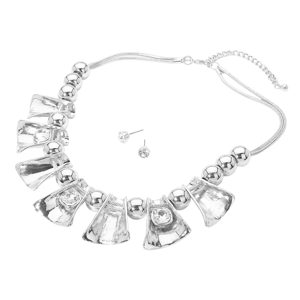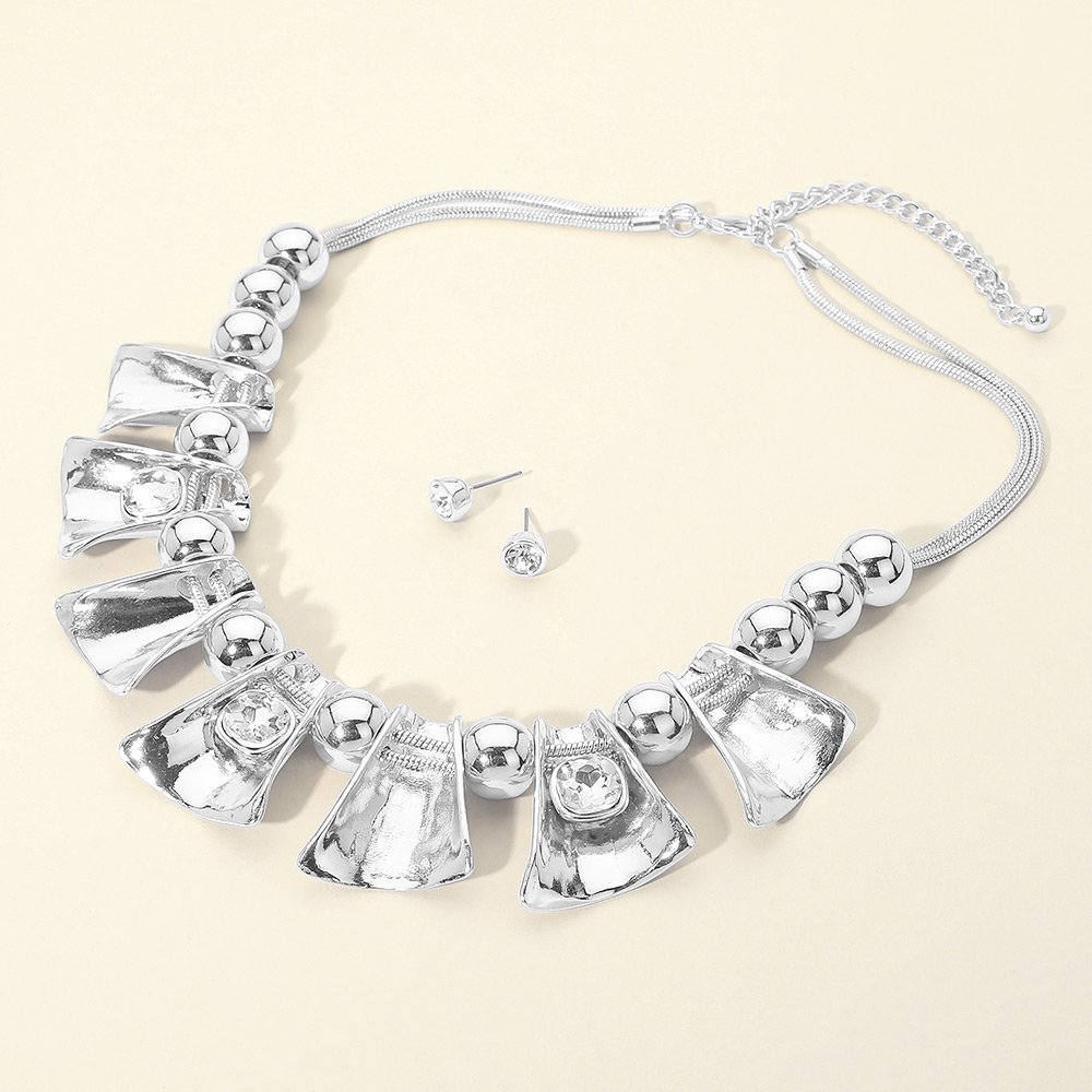 • Statement necklace and stud earring set designed with bold sculpted accents, rounded bead detailing, and radiant stone highlights for a dramatic, fashion-forward look. Perfect for elevating dresses, evening wear, or special occasion outfits. A standout accessory ideal for gifting or curated boutique jewelry collections.