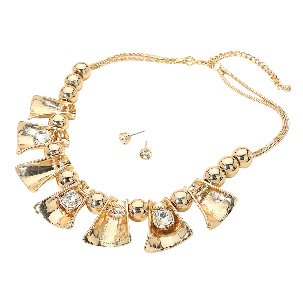 Details • Necklace Size : 18" + 3.25" L • Decor Size : 1.25" L • Earrings Size : 0.3" L • Statement necklace and stud earring set designed with bold sculpted accents, rounded bead detailing, and radiant stone highlights for a dramatic, fashion-forward look. Perfect for elevating dresses, evening wear, or special occasion outfits. A standout accessory ideal for gifting or curated boutique jewelry collections. • Lead and Nickel Compliant