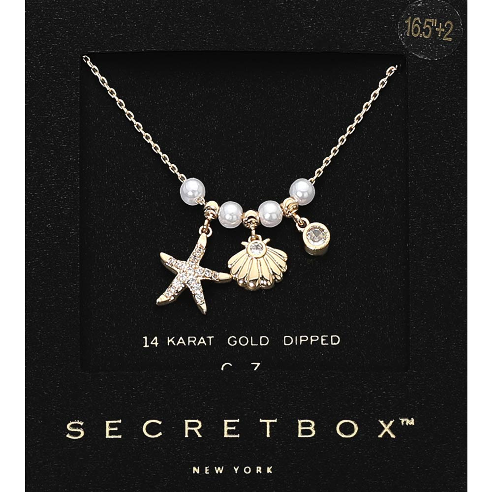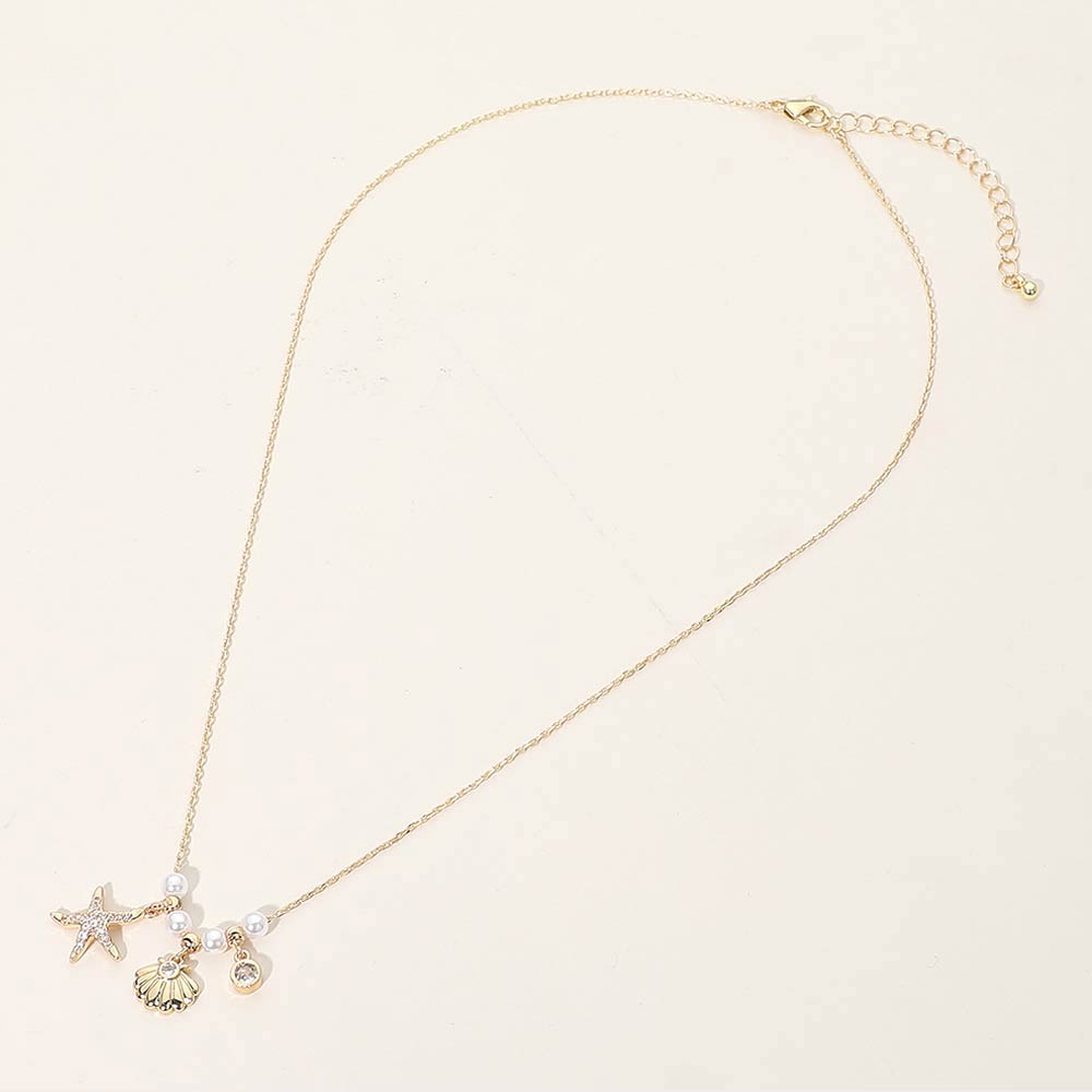 Details • Necklace Size : 16.5" + 2" L • Decor Size : 0.7" L • Charm station necklace featuring a starfish, shell, and accent charms paired with smooth bead details along a delicate chain. Designed to bring a playful yet polished touch to everyday looks, this necklace layers easily or stands out on its own, making it ideal for gifting, seasonal edits, and boutique jewelry collections. • CZ Cubic Zirconia • Gold Dipped