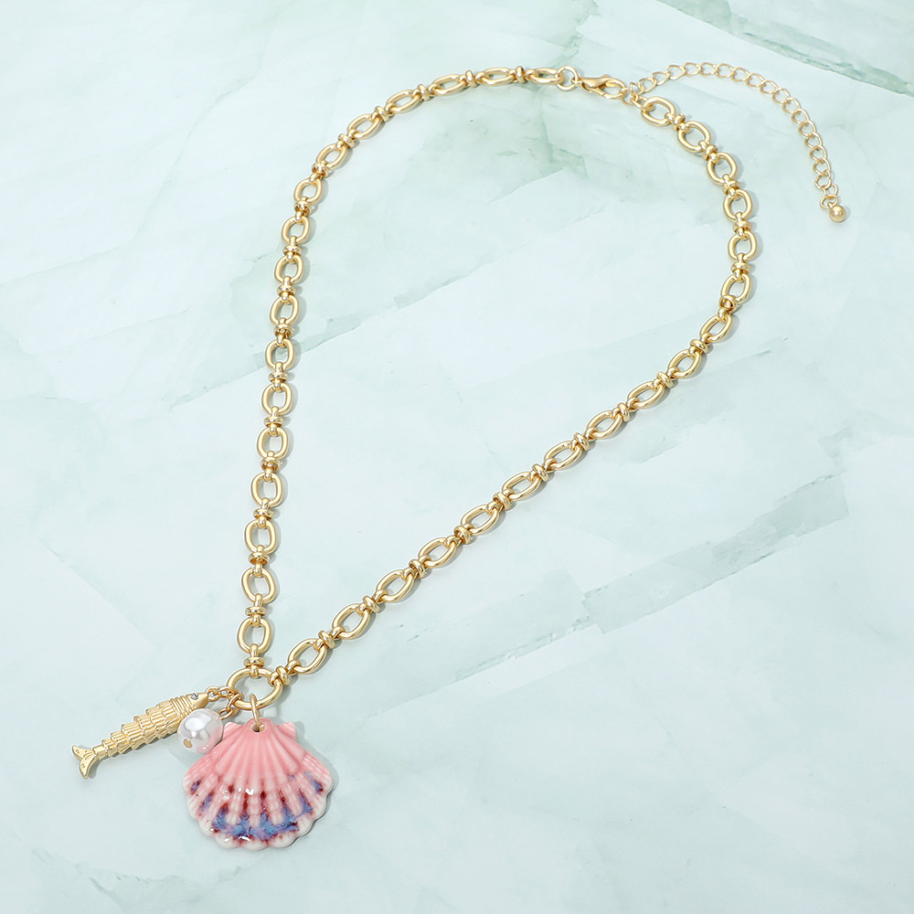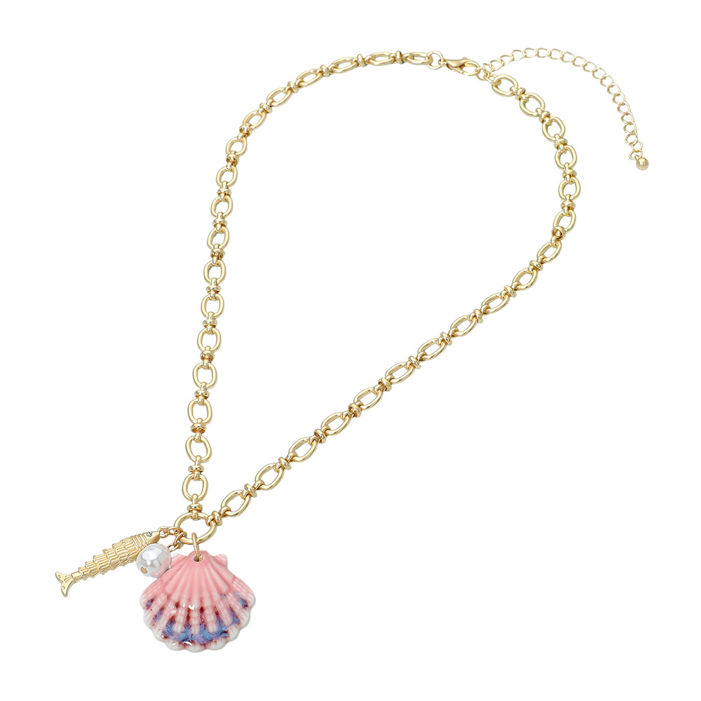Details • Necklace Size : 17" + 3" L • Pendant Size : 1.25" X 1.25" • Coastal-inspired pendant necklace featuring a sculpted shell charm paired with a delicate accent detail on a classic chain. Designed to add an effortless beachy touch to everyday outfits, this necklace is ideal for seasonal collections, resort styling, and giftable accessory assortments for boutiques and online shops. • Lead and Nickel Compliant