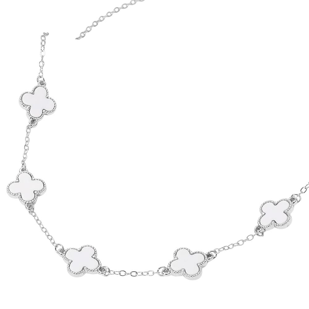 White Gold Dipped Mother Of Pearl Quatrefoil Charm Station Chunky Chain Necklace
