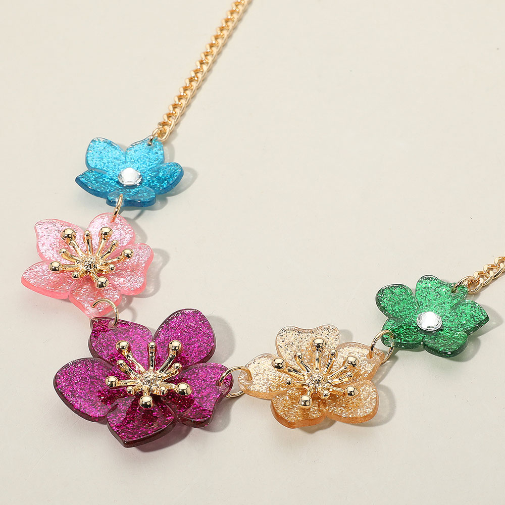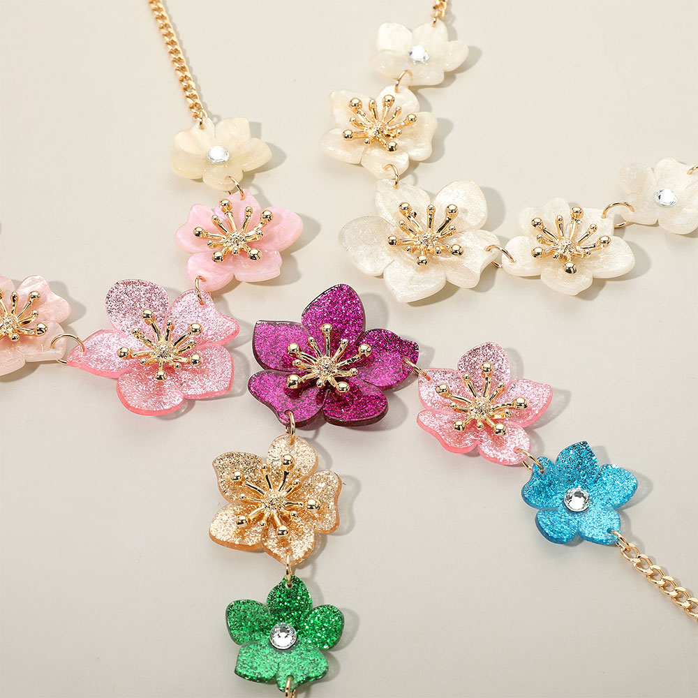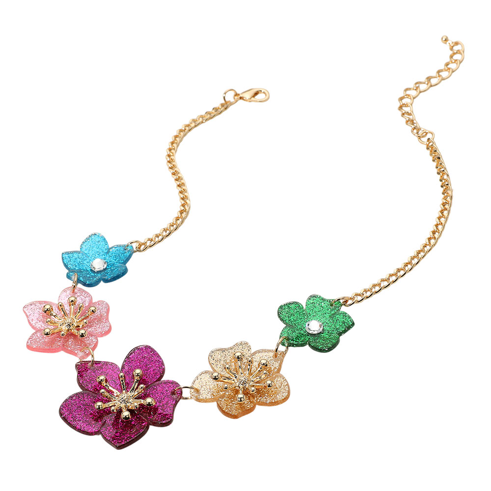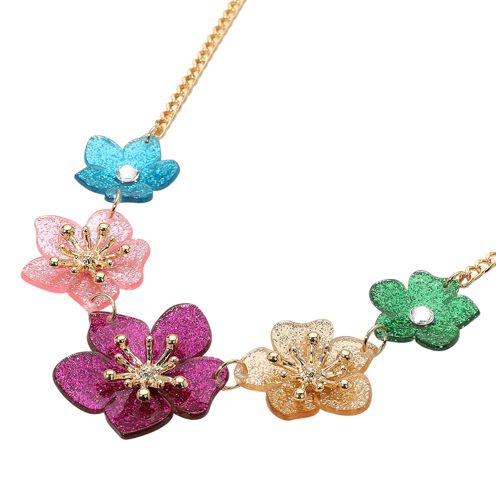 Details • Necklace Size : 18.5" + 3" L • Decor Size : 2" L • Bold floral necklace featuring a series of shimmering flower accents with textured finishes and crystal details. Attached to a gold-tone chain with adjustable length, it brings a vibrant, statement-making flair to any outfit. Ideal for festive events, parties, or standout everyday style. • Lead and Nickel Compliant