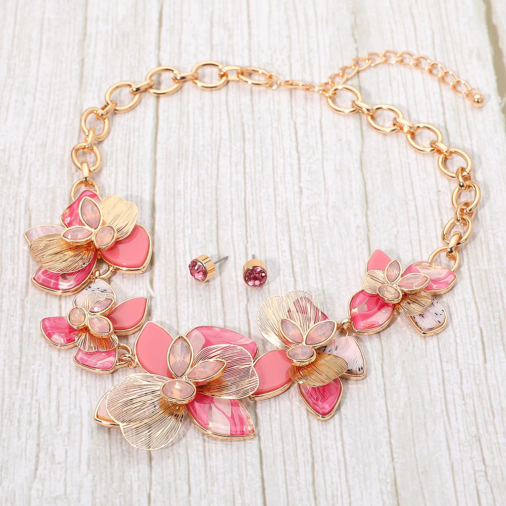 Details • Necklace Size : 17" + 3" L • Decor Size : 2" L • Earrings Size : 0.3" L • Elegant floral statement necklace paired with matching stud earrings for a coordinated and eye-catching look. Designed with layered petal details, this accessory set adds a touch of sophistication and charm, making it ideal for special occasions or standout styling. • Lead and Nickel Compliant