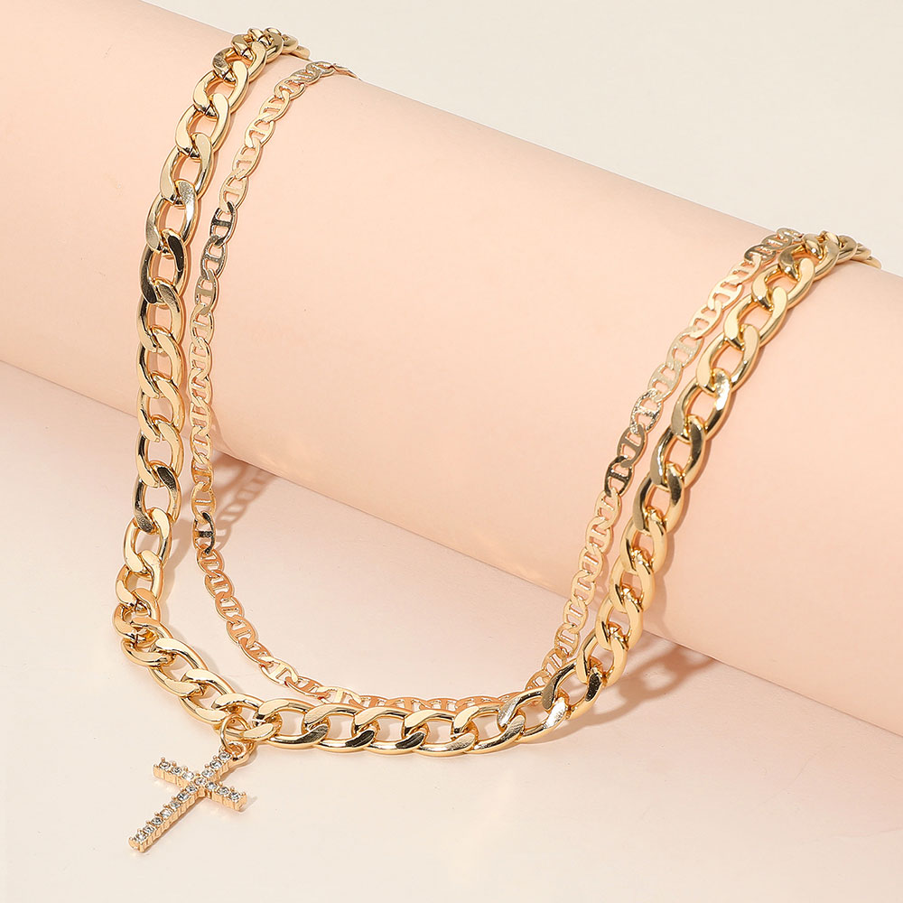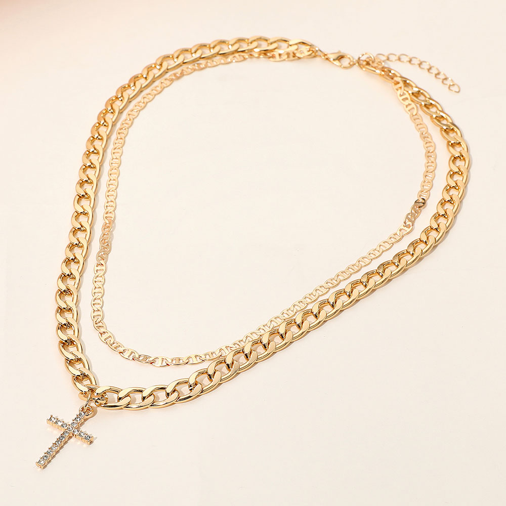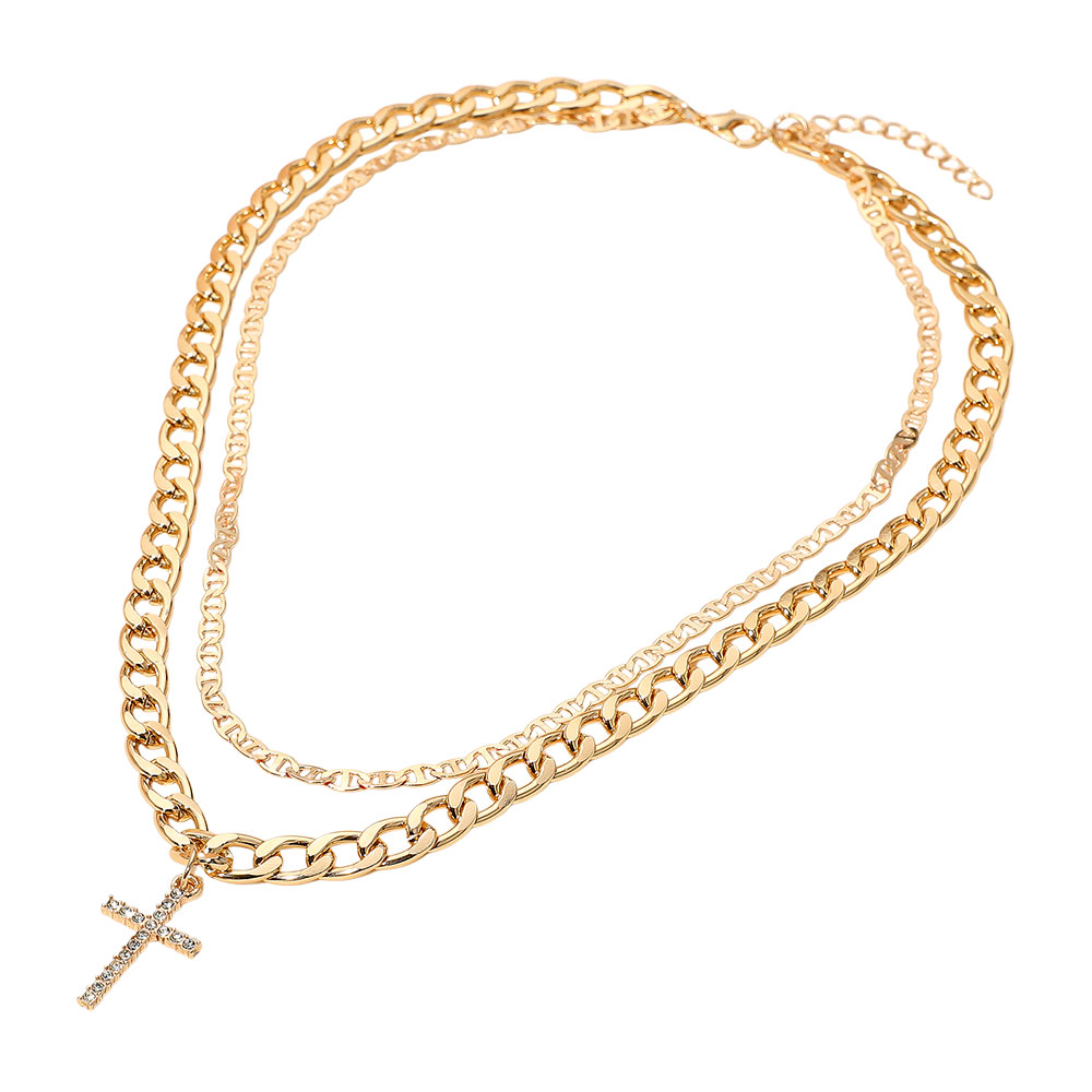Details • Necklace Size : 16" + 2" L • Decor Size : 2.4" L • Add elegance to any look with this layered chain necklace featuring a detailed cross pendant. Its versatile design makes it perfect for pairing with casual or formal outfits, offering timeless style for everyday wear or special occasions.