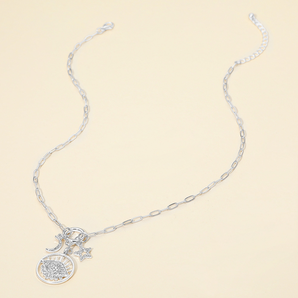 Details • Necklace Size : 17" + 2.5" L • Decor Size : 1.75" L • Add a touch of celestial elegance with this charm necklace featuring moon, star, and eye pendants adorned with sparkling stones. Perfect for layering or wearing solo, this piece blends modern style with symbolic beauty, making it ideal for both everyday wear and special occasions. • Lead and Nickel Compliant