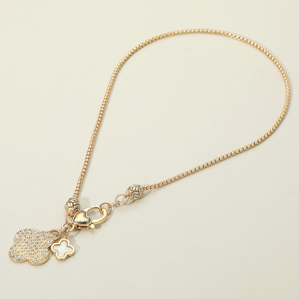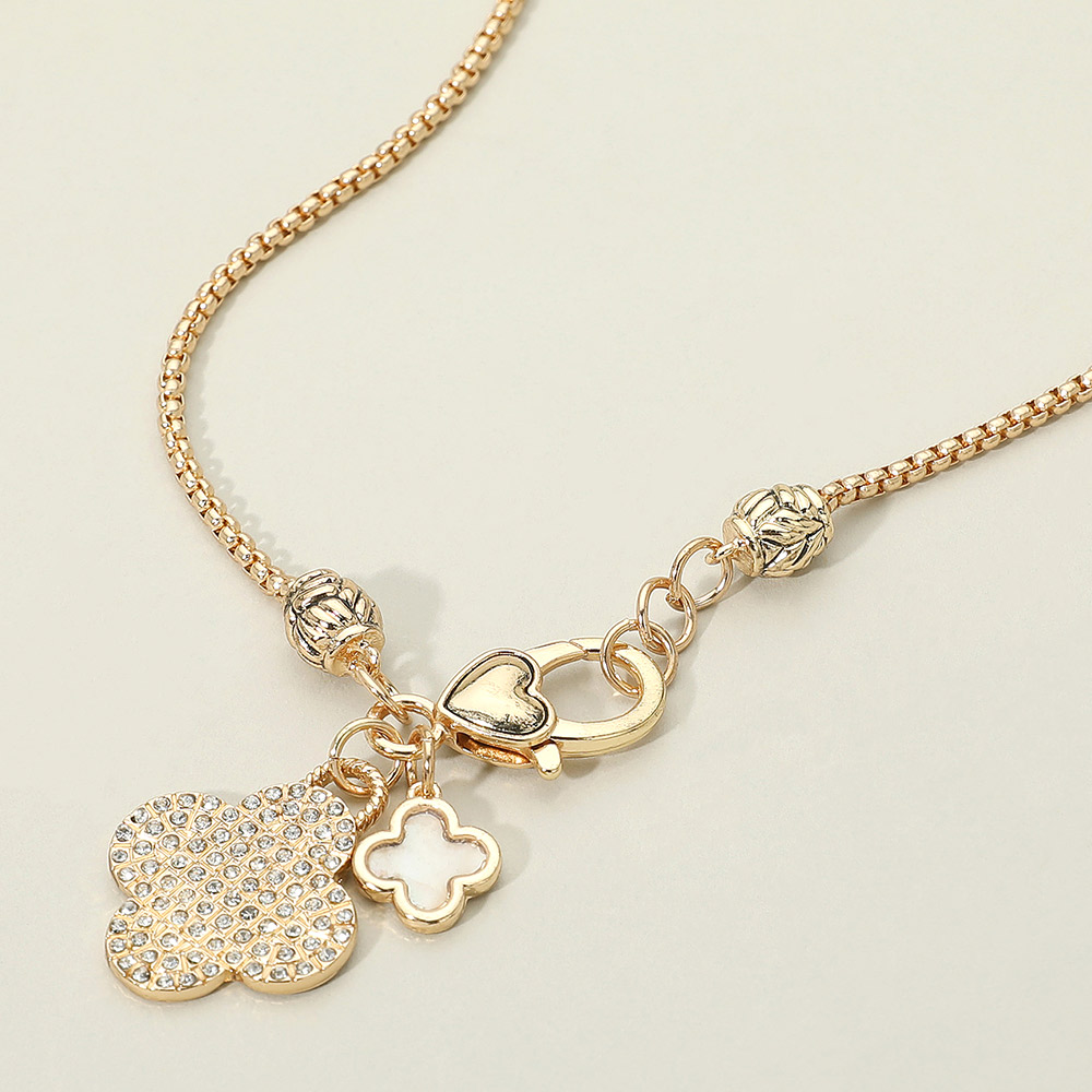 Details • Necklace Size : 16" + 0.5" L • Decor Size : 1.3" L • Add charm and elegance with this quatrefoil pendant necklace featuring sparkling crystal detail, a mini enamel quatrefoil, and a heart accent. The mixed metal design creates a unique layered look, perfect for gifting or personal wear. A versatile piece that brings style and meaning to any outfit. • Lead and Nickel Compliant