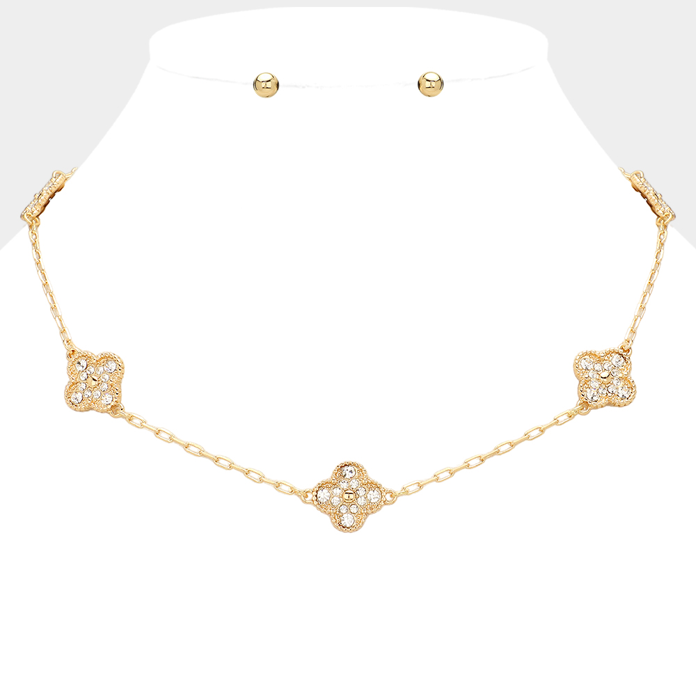CZ Stone Paved Quatrefoil Pendant Pointed Faceted Beaded Choker Necklace