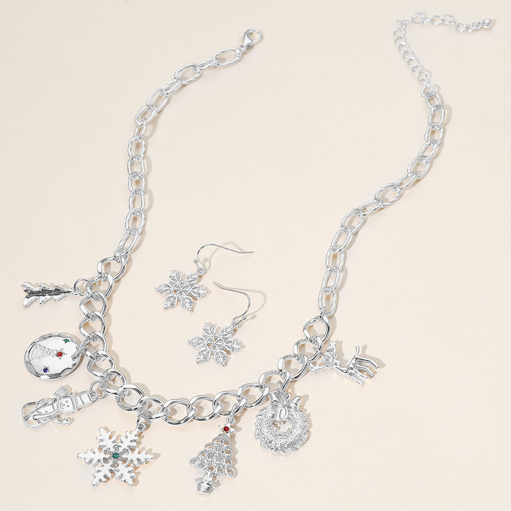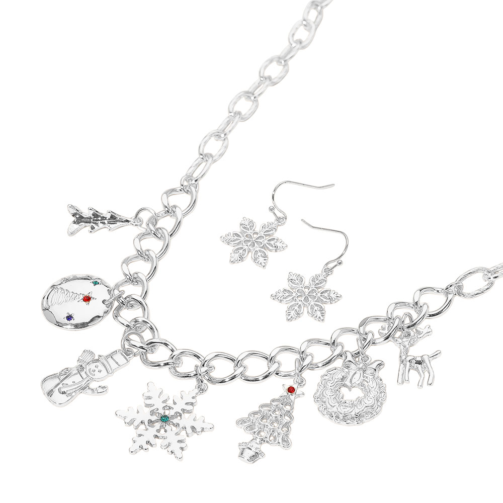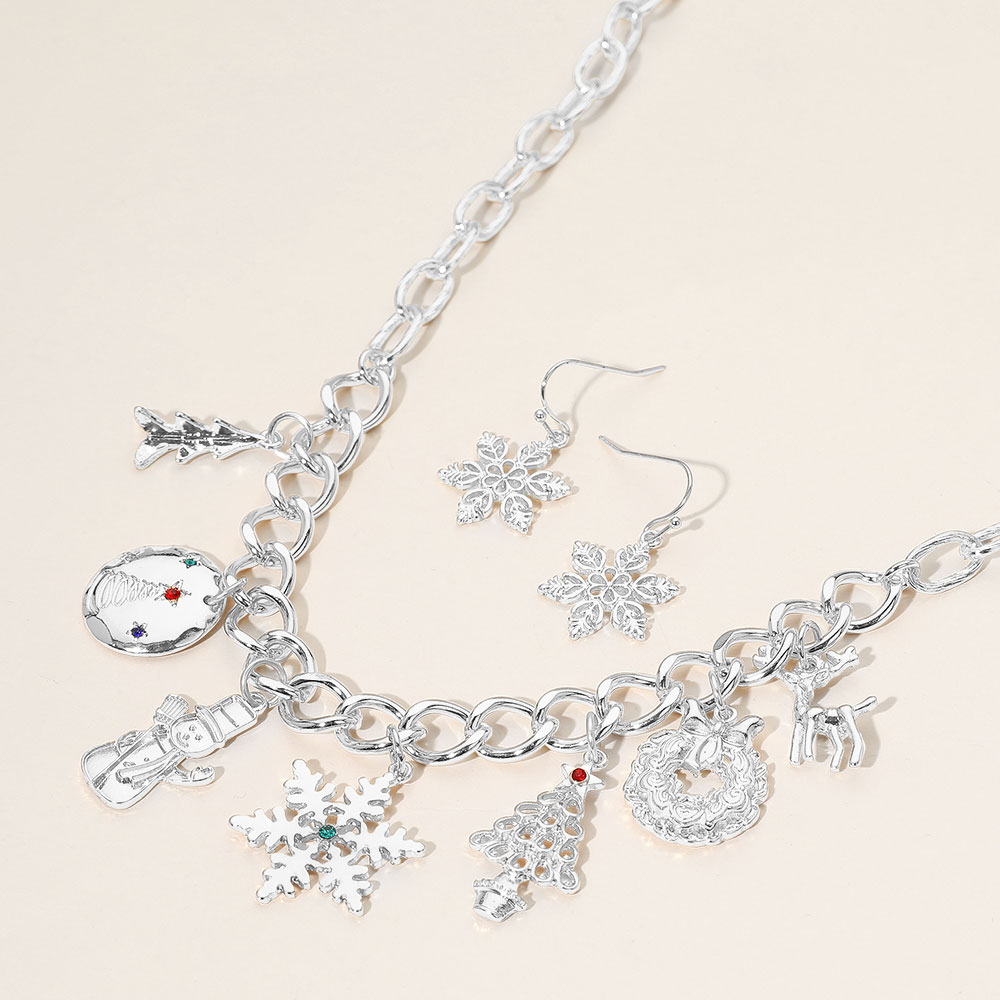 Details • Necklace Size : 15" + 3.5" L • Decor Size : 1.25" L • Earring Size : 1.4" L • Shine bright this season with this Christmas charm necklace and matching snowflake earrings. Features festive charms including a snowman, Christmas tree, wreath, reindeer, and more. Lightweight and adjustable—perfect for holiday parties, gifts, and festive looks. • Lead and Nickel Compliant