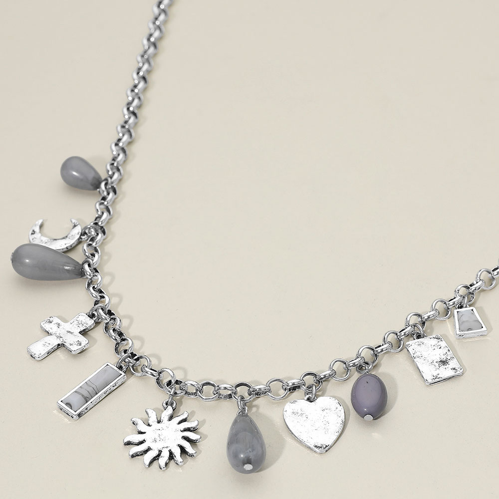 Sunburst Cross Heart Teardrop Stone Charm Station Necklace