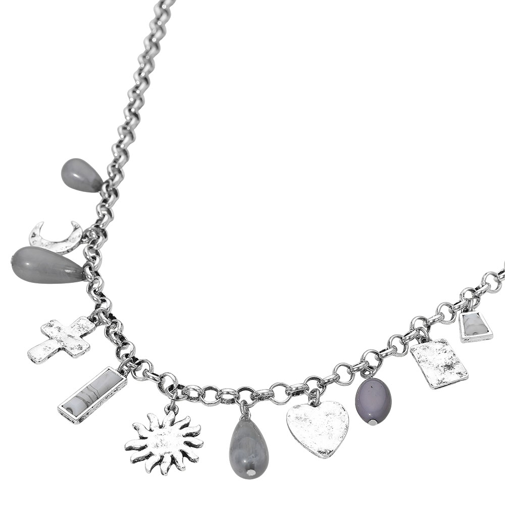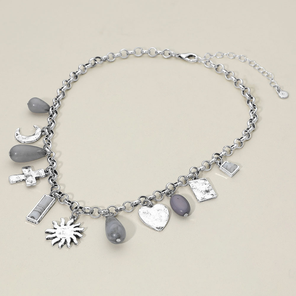 • Add personality to any outfit with this charm cluster statement necklace, featuring assorted symbolic charms arranged along a bold chain for an eye-catching layered look. Designed to elevate casual wear or complement dressier styles with playful, modern flair.