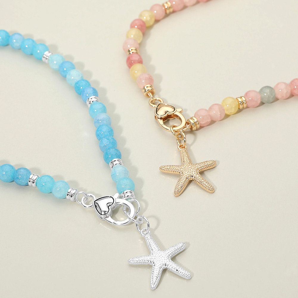 Textured Metal Starfish Charm Pendant Beaded Necklace