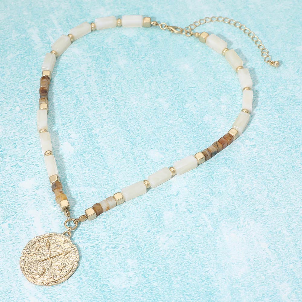 • This beaded necklace features a refined sequence of geometric beads accented by a textured coin pendant that adds symbolic charm and visual focus. Designed for easy everyday styling, it layers beautifully or stands alone as a subtle statement. A versatile choice for boutiques seeking modern, giftable jewelry with timeless appeal and effortless wearability.