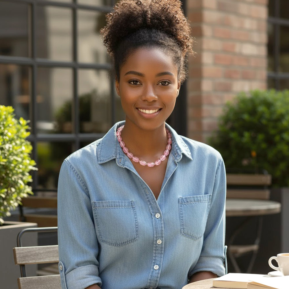 • A refined statement necklace strung with smooth translucent pebble beads that catch the light with subtle depth. Finished with delicate spacer accents and an adjustable chain, it layers easily with other favorites or stands alone as a polished centerpiece from day to evening.