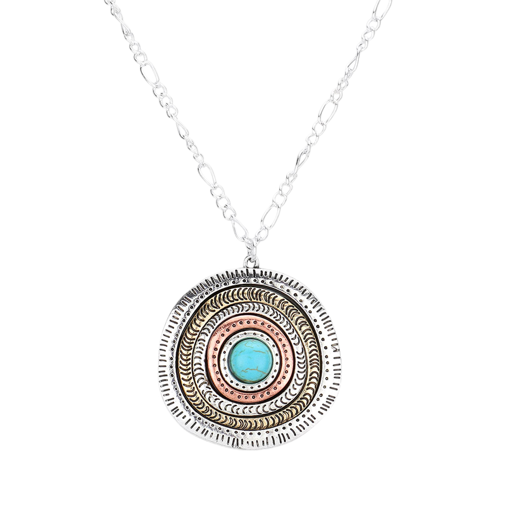 Turquoise Centered Irregular Metal Round Pendant Necklace
