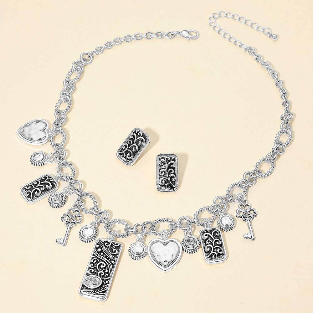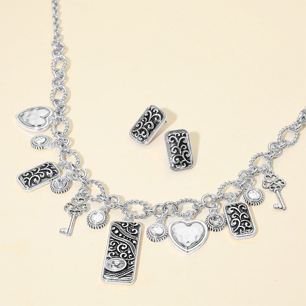 • Intricately designed necklace and earring set featuring ornate charms, including hearts, keys, and decorative panels. A timeless accessory that adds elegance and sophistication to both casual and formal outfits.