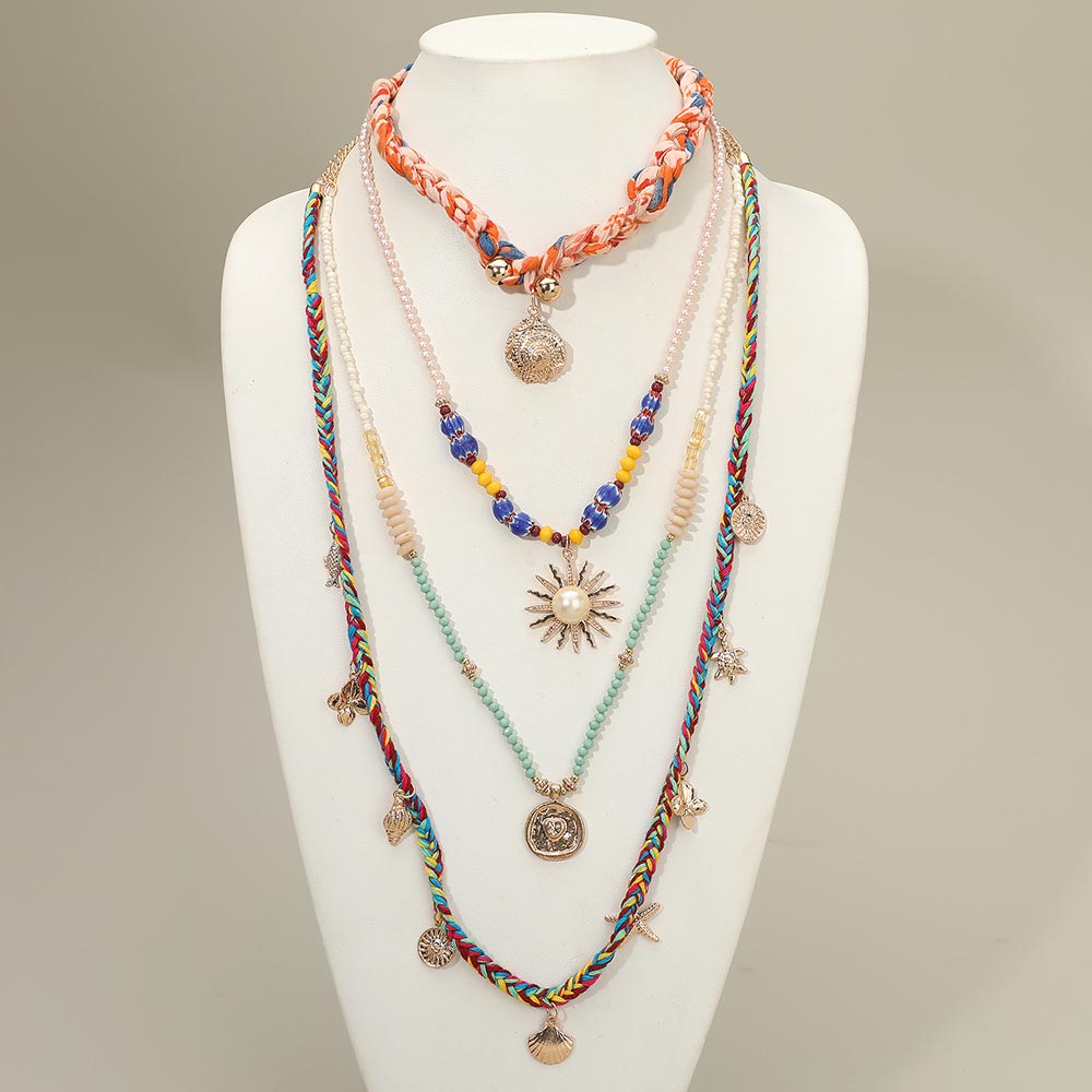 Details • Necklace Size : 16" + 3" L • Decor Size : 11" L • Stylish multi-layered necklace set featuring braided cords, beaded strands, and assorted charms including sun, seashell, coin, and more. A statement layered accessory that adds playful detail and standout appeal to any outfit. Perfect for everyday wear or vacation looks. • Lead and Nickel Compliant