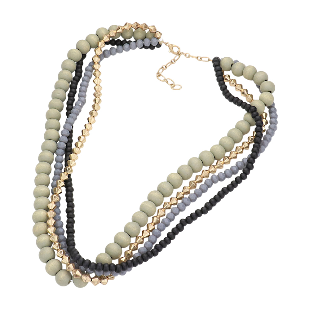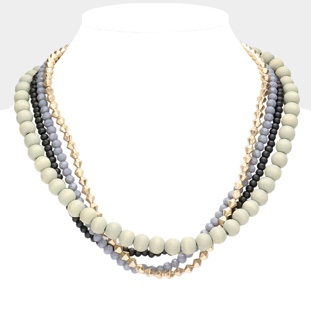 Wood Heishi Beaded Abalone Crescent Pendant Triple Layered Pendant Necklace