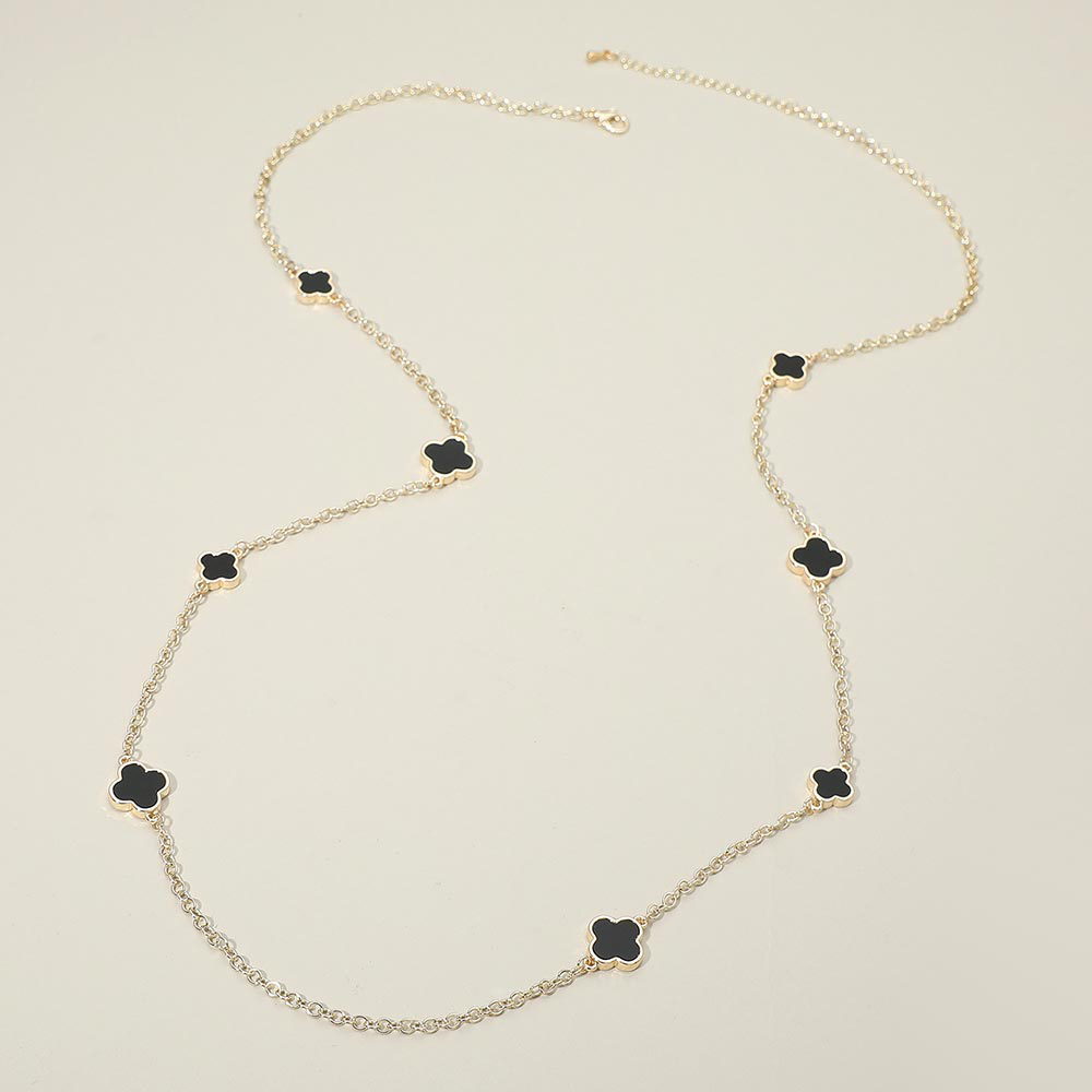 • This long station necklace features delicate quatrefoil-shaped accents arranged along a refined chain, creating an elegant, versatile accessory. Its lightweight design makes it perfect for layering or wearing alone, offering a polished touch that transitions effortlessly from day to evening.
