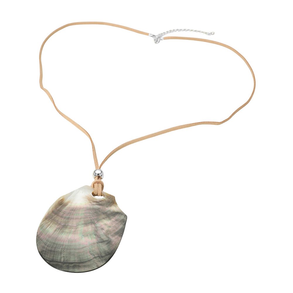 Details • Necklace Size : 30" + 3.25" L • Pendant Size : 2.6" X 3.5" • A long necklace featuring an organic teardrop-shaped abalone shell-style pendant with natural texture and soft shine. Designed for effortless styling, this statement piece works well alone or layered, adding a relaxed yet polished look to everyday and resort-inspired outfits. Ideal for boutiques seeking eye-catching pendants with versatile wear appeal. • Lead and Nickel Compliant