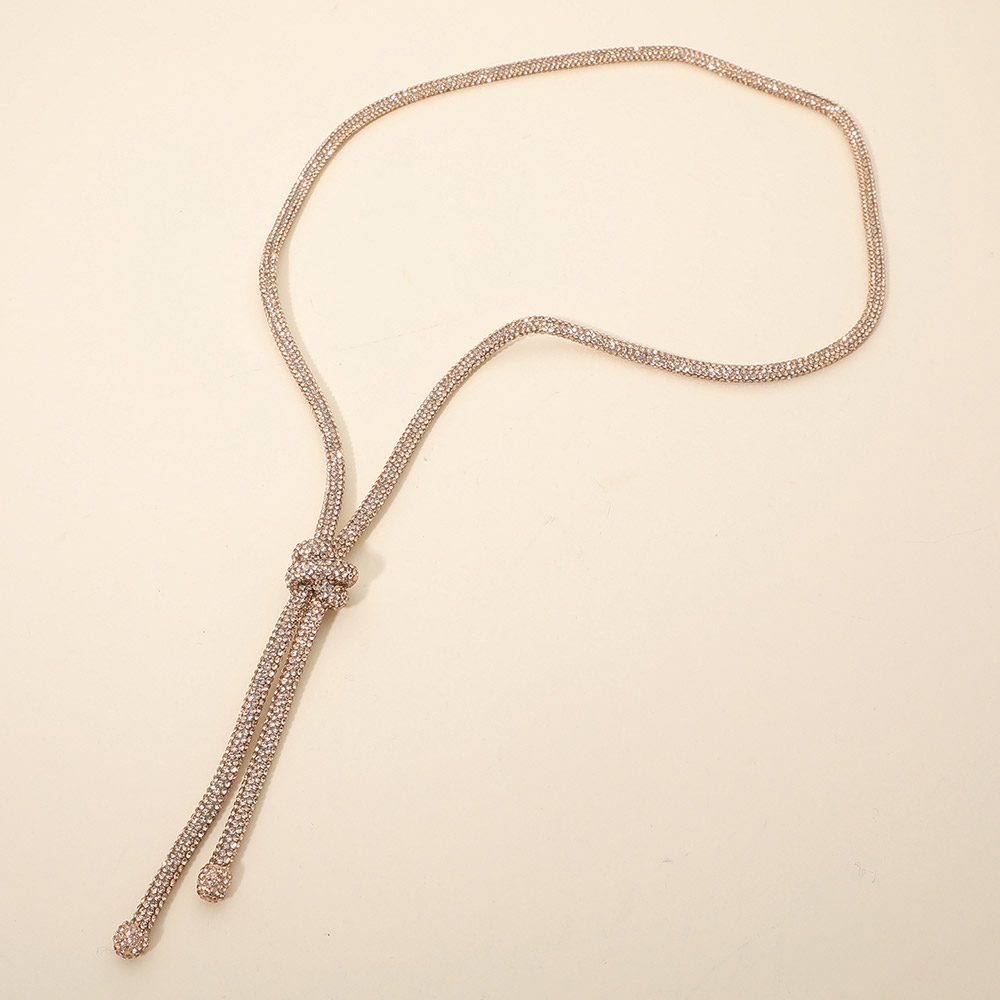 • This elegant bling studded lariat chain necklace features a sleek knotted design that drapes beautifully for a modern, sophisticated look. Perfect for both casual and formal settings, its adjustable length and minimalist charm make it a versatile addition to any jewelry collection.