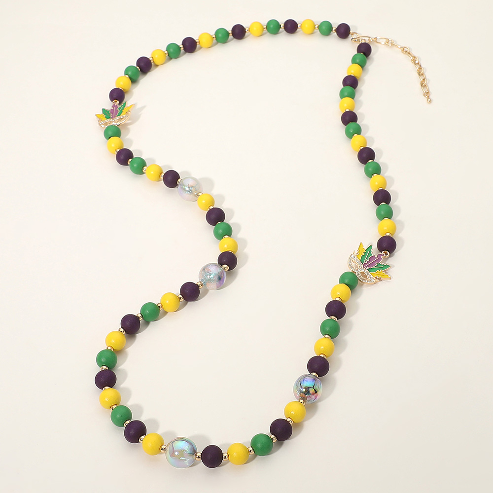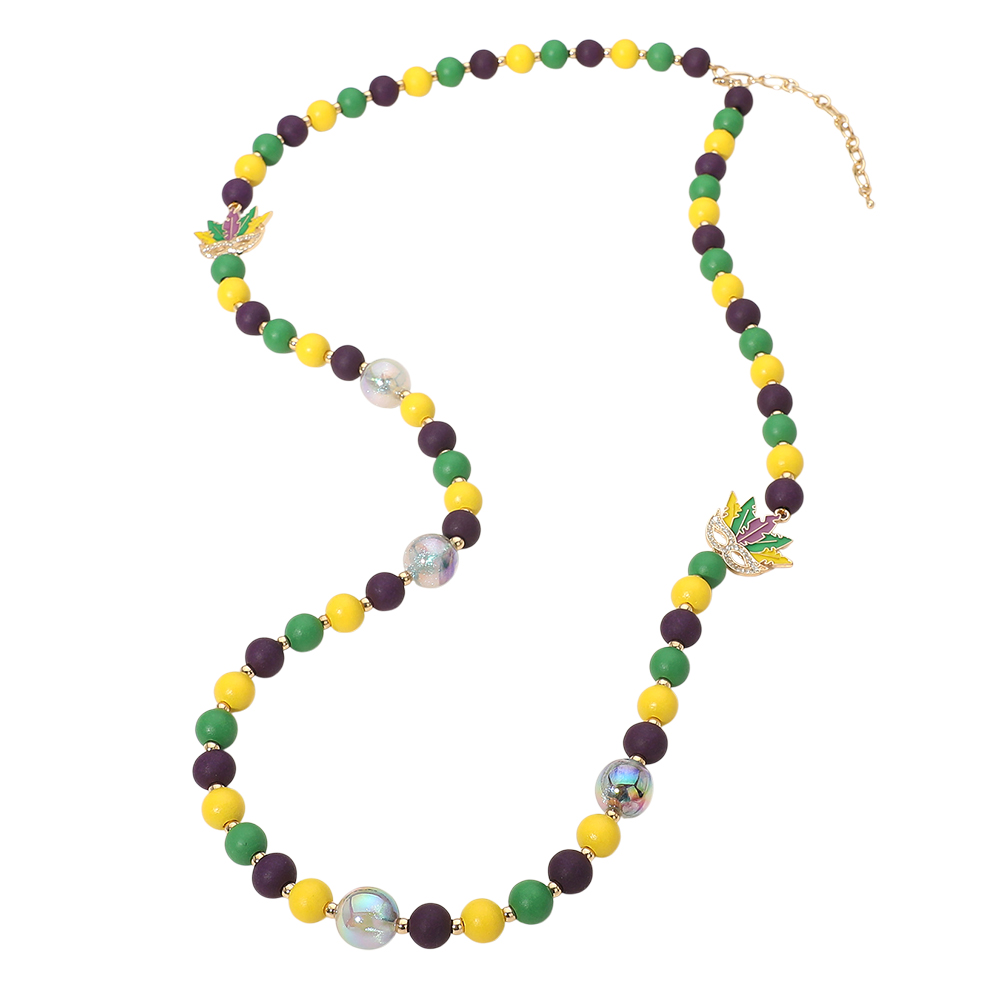 Details • Necklace Size : 34" + 3.25" L • Decor Size : 1" L • Statement Mardi Gras–inspired necklace designed with smooth round beads, luminous accent beads, and decorative charm details spaced throughout the strand. Finished with an adjustable chain for comfortable wear. Ideal for parade outfits, themed events, party styling, and festive boutique displays. A versatile accessory that adds playful character and celebration-ready appeal. • Lead and Nickel Compliant
