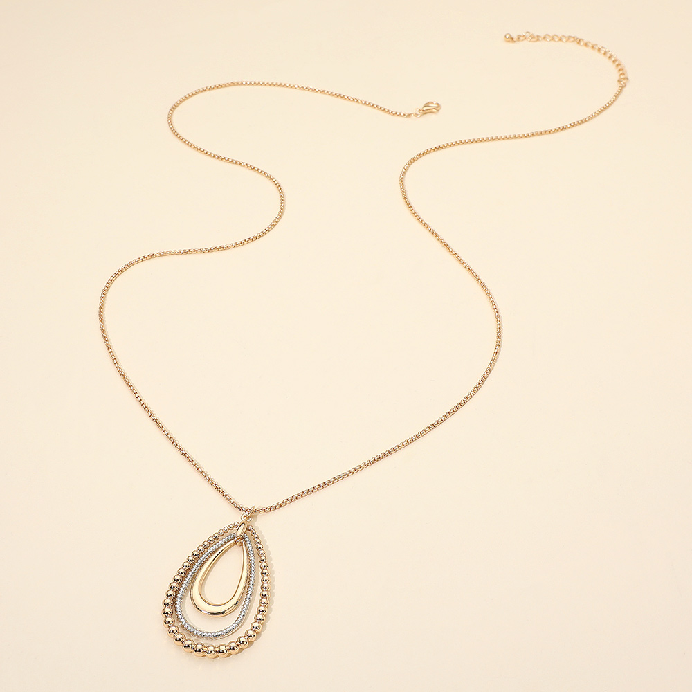 Details • Necklace Size : 34.5" + 3.5" L • Pendant Size : 1.4" X 2.25" • Showcases layered open teardrop pendants with mixed textures that create depth and elegant movement. A refined statement piece designed to elevate everyday looks and complement evening or special-occasion outfits. • Lead and Nickel Compliant