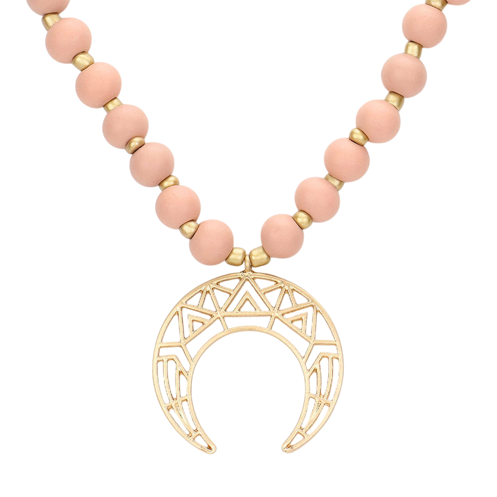 Metal Cutout Double Horn Pendant Wood Long Necklace