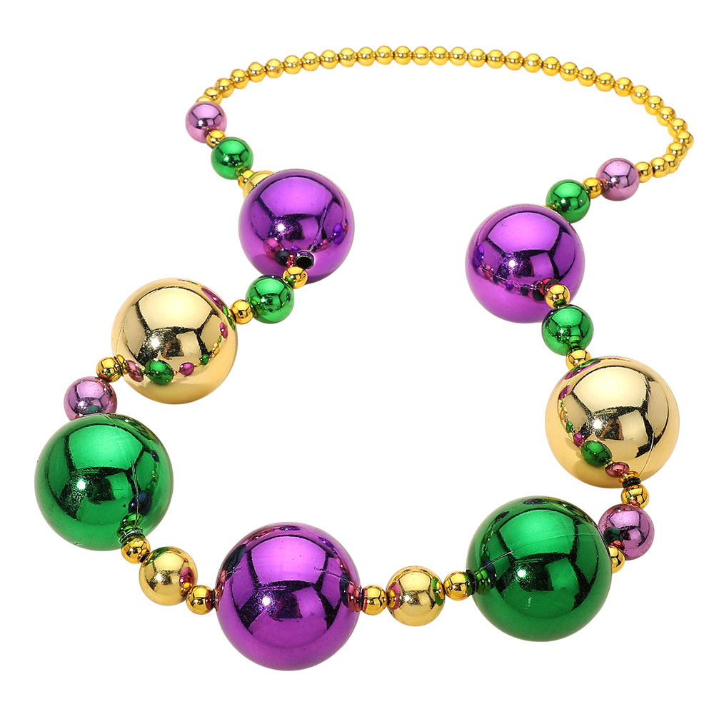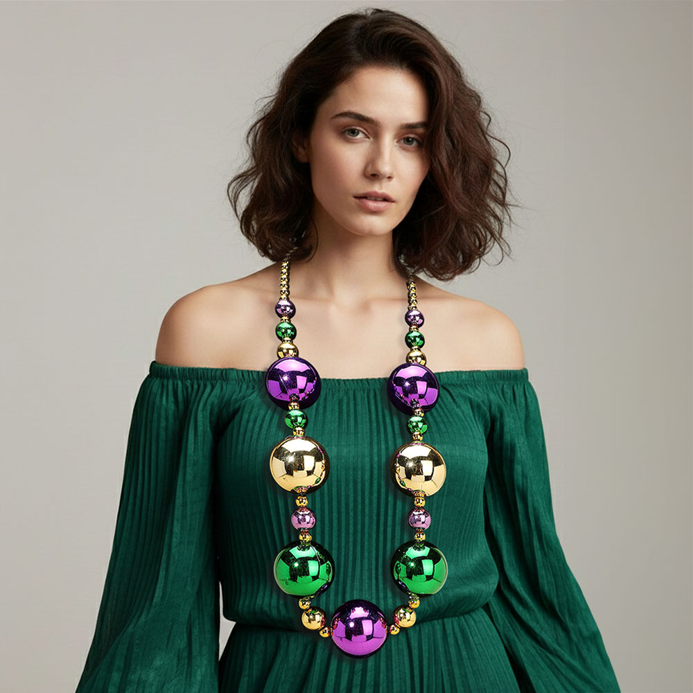 Details • Necklace Size : 40" L • Decor Size : 2" L • Oversized statement beaded necklace featuring bold round accents arranged for dramatic impact and playful movement. Designed to stand out at parties, themed events, parades, and celebrations, this necklace elevates simple outfits with eye-catching style while remaining lightweight and easy to wear. • Lead and Nickel Compliant
