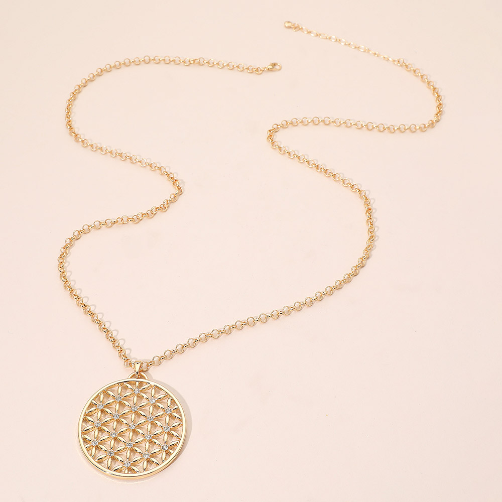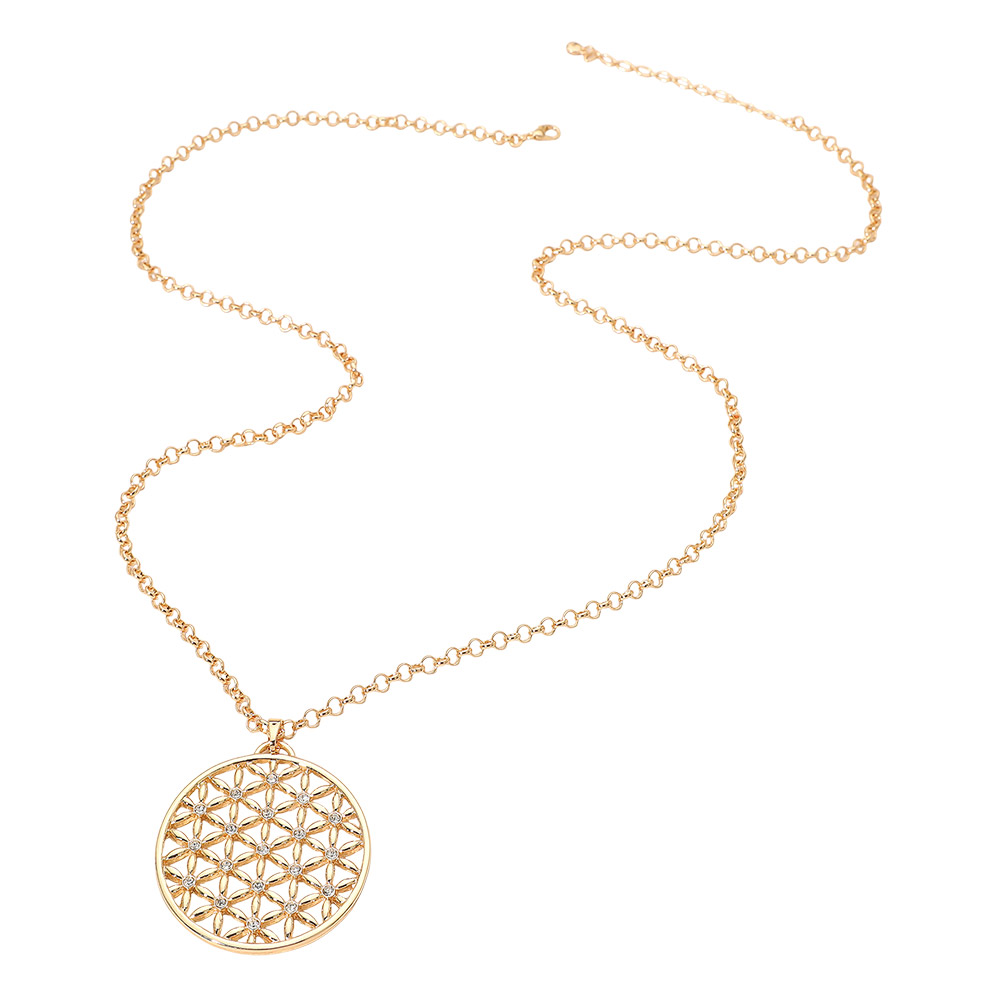 Rhinestone Accented Geometric Floral Circle Pendant Long Necklace