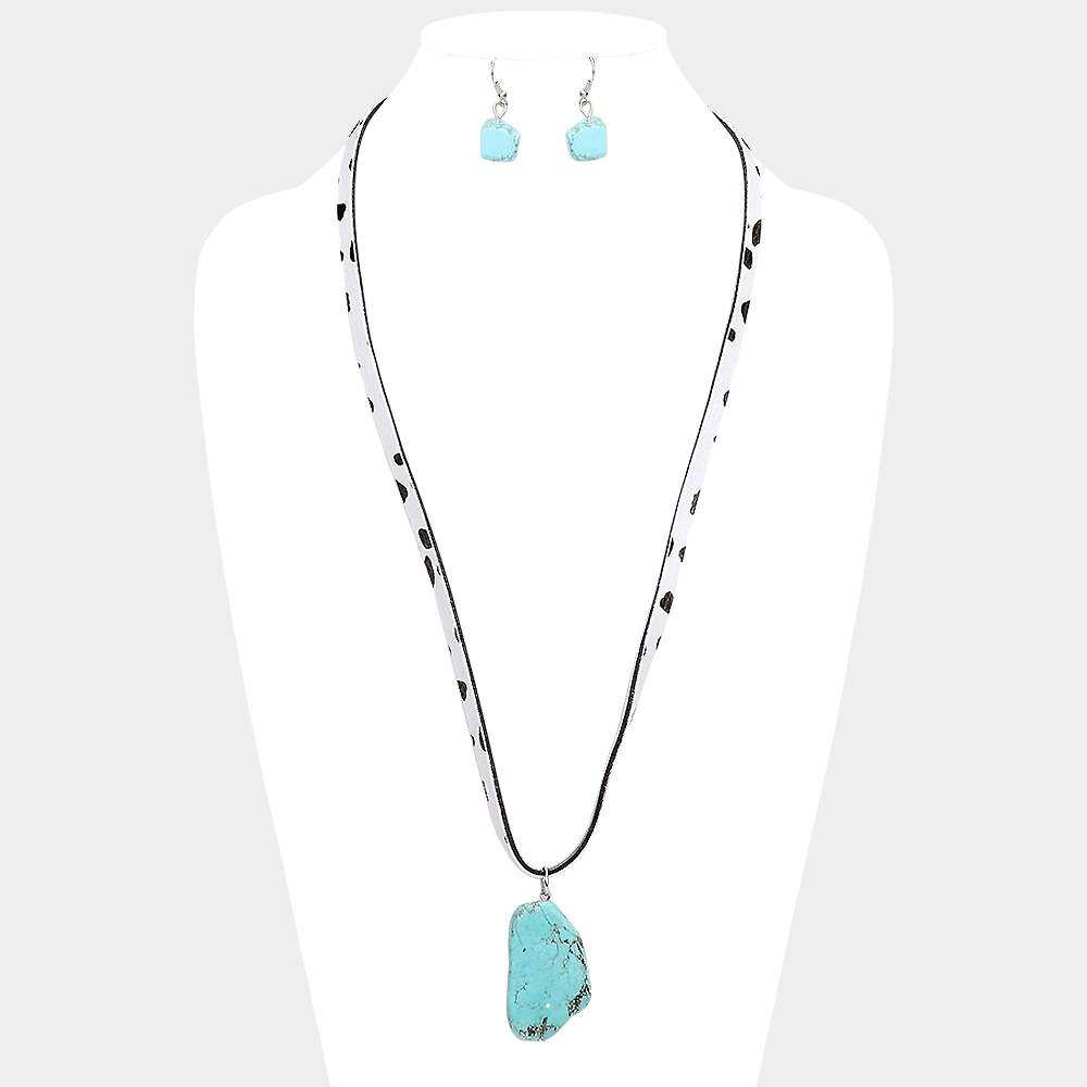 Turquoise Pendant Cow Patterned Faux Leather Long Necklace