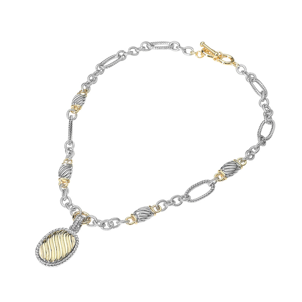 Details • Necklace Size : 18" + 1" L • Pendant Size : 0.8" X 1.8" • Toggle Closure • This oval pendant toggle chain necklace features mixed link detailing and a sculpted oval charm that adds dimension and interest to any look. Designed for effortless styling, it works beautifully as a standalone statement or layered with other necklaces, making it ideal for everyday wear, gifting, and boutique jewelry collections. • Gold Dipped