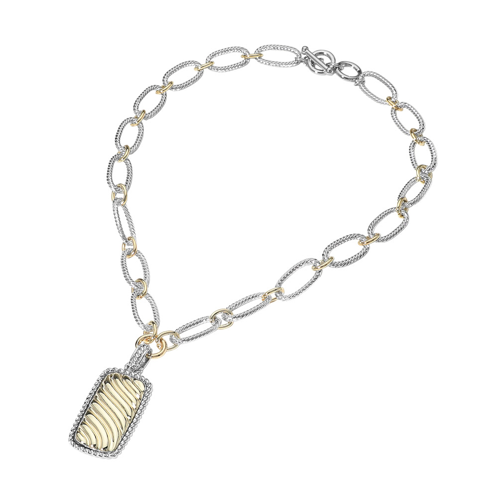 Details • Necklace Size : 17" + 1" L • Pendant Size : 0.75" X 1.75" • Toggle Closure • This rectangle pendant mixed link chain necklace features a textured statement charm paired with bold oval links for a modern, elevated look. Designed to stand out on its own or layer effortlessly, it adds structure and style to everyday outfits, workwear, and evening looks. A versatile choice for gifting and curated jewelry collections. • Gold Dipped
