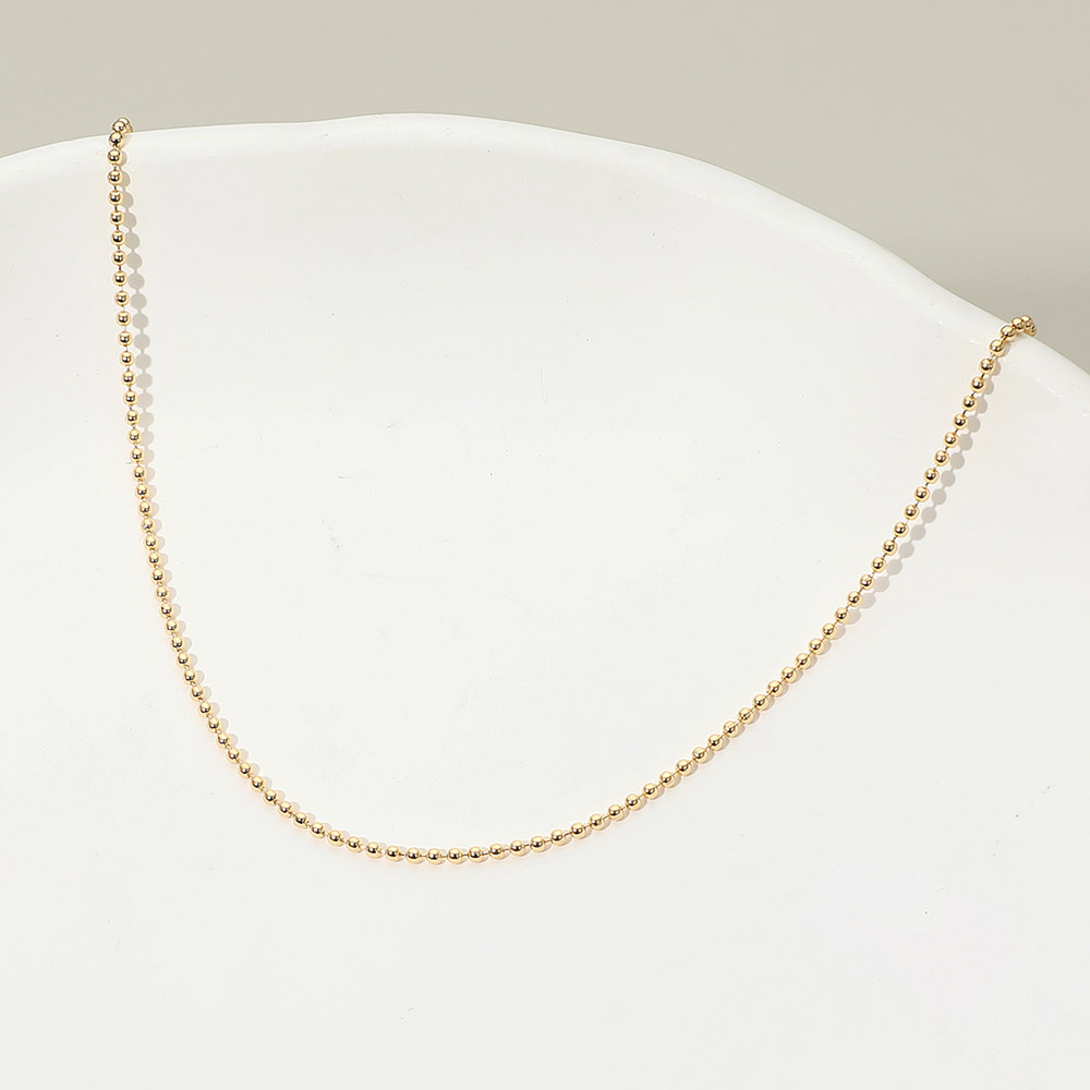 Details • Necklace Size : 16" L • Decor Size : 0.1" L (2mm) • Elegant bead chain necklace featuring small, polished round links that create a smooth and refined texture. A timeless minimalist piece perfect for layering or wearing solo, adding effortless shine to both casual and dressy looks. • Lead and Nickel Compliant • Gold Filled • Made In Brazil