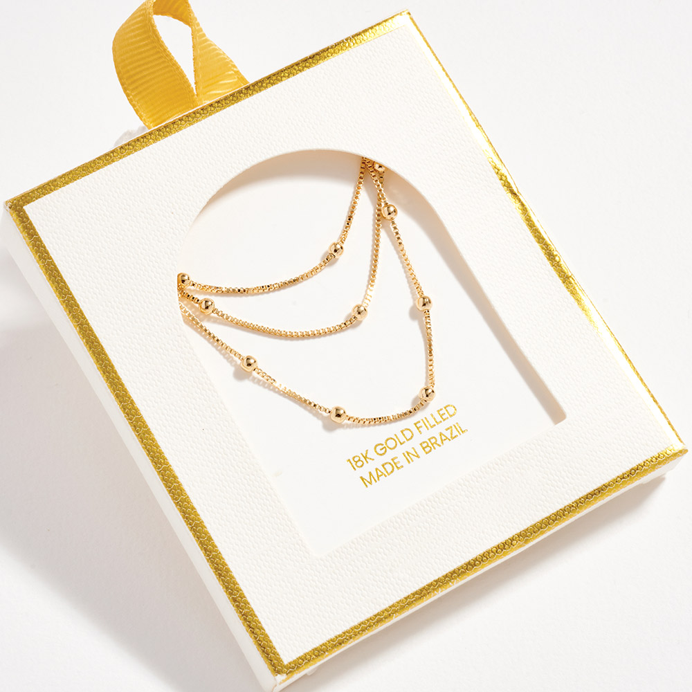 Details • Necklace Size : 17.5" + 1.5" L • Decor Size : 1" L • Delicate layered chain bracelet designed with evenly spaced bead accents for a refined, modern look. Ideal for everyday wear, stacking with other bracelets, or minimalist styling. A versatile accessory that adds subtle movement and elegance to casual outfits, workwear, and thoughtful gifting moments. • Gold Filled • Hypoallergenic • Lead and Nickel Compliant • Made In Brazil