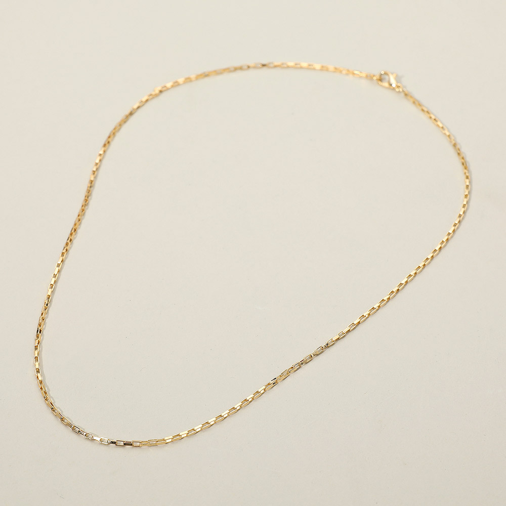 Details • Necklace Size : 18" L • Decor Size : 0.1" L (2mm) • Stylish geometric link box chain necklace featuring sleek rectangular links for a modern minimalist look. Lightweight and versatile, this necklace adds a touch of refined elegance—perfect for layering or wearing solo with any outfit. • Gold Filled • Lead and Nickel Compliant • Made In Brazil