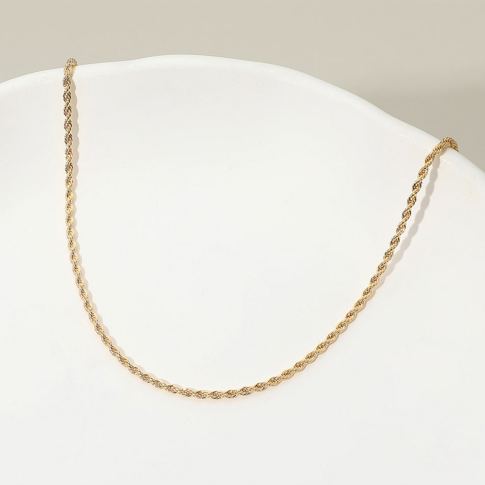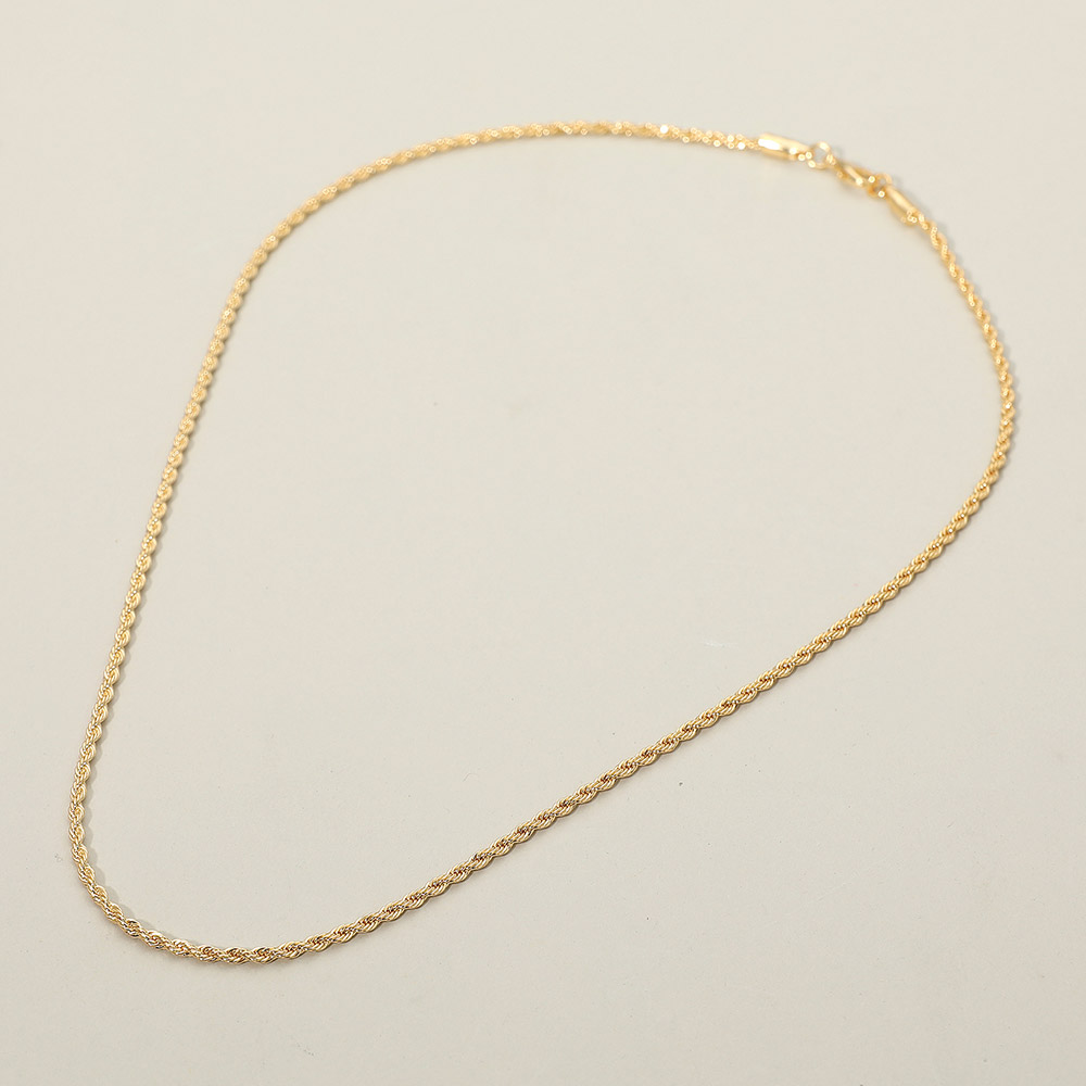 Details • Necklace Size : 18" L • Decor Size : 0.1" L (2mm) • Classic twisted rope chain necklace featuring delicate braided links that catch the light beautifully. Its textured design adds depth and shine, making it a timeless accessory for elegant layering or a polished standalone look. • Lead and Nickel Compliant • Gold Filled • Made In Brazil