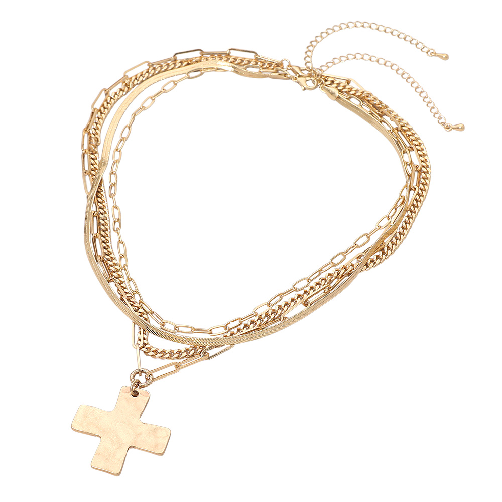 2PCS - Hammered Metal Cross Pendant Accent Multi Chain Layered Necklaces
