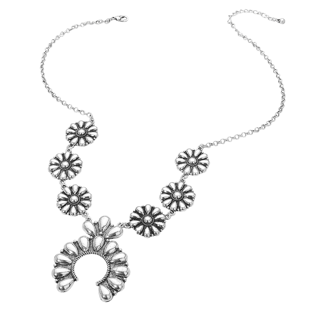 Details • Necklace Size : 22" + 3" L • Decor Size : 0.9" L • Pendant Size : 1.9" X 2.25" • Statement necklace featuring a cascading floral design that leads to a bold crescent charm centerpiece. Crafted to create visual impact with intricate detailing and balanced movement, this necklace is ideal for boho, western-inspired, festival, or boutique jewelry collections seeking an eye-catching focal piece. • Lead and Nickel Compliant