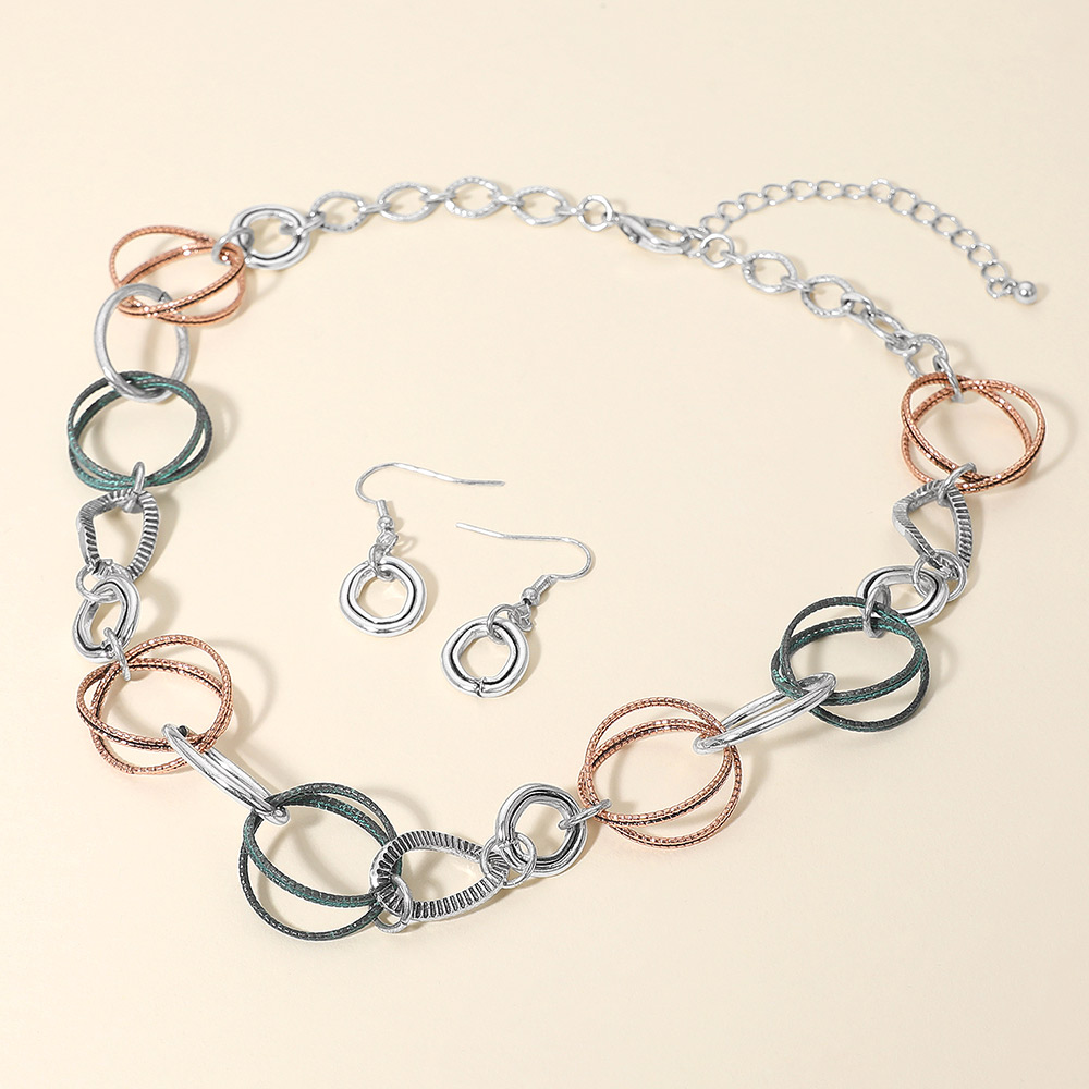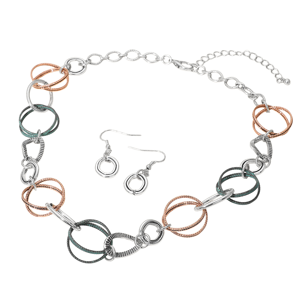 • This modern necklace and earring set showcases interlocking rings in varied shapes and textured finishes, creating a stylish, sculptural look. Designed to complement both casual and elevated outfits, it adds artistic detail and versatile elegance to any jewelry collection.